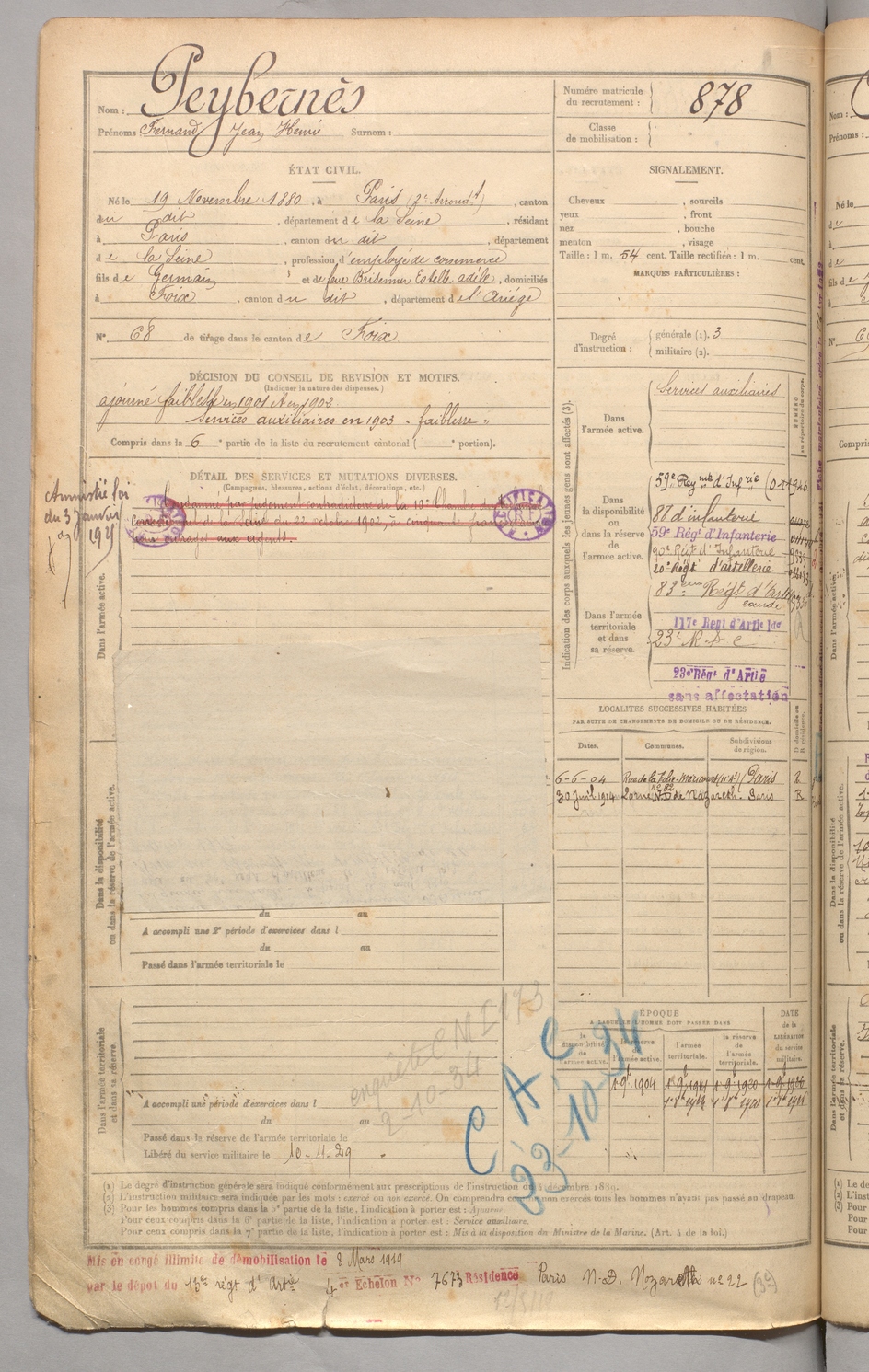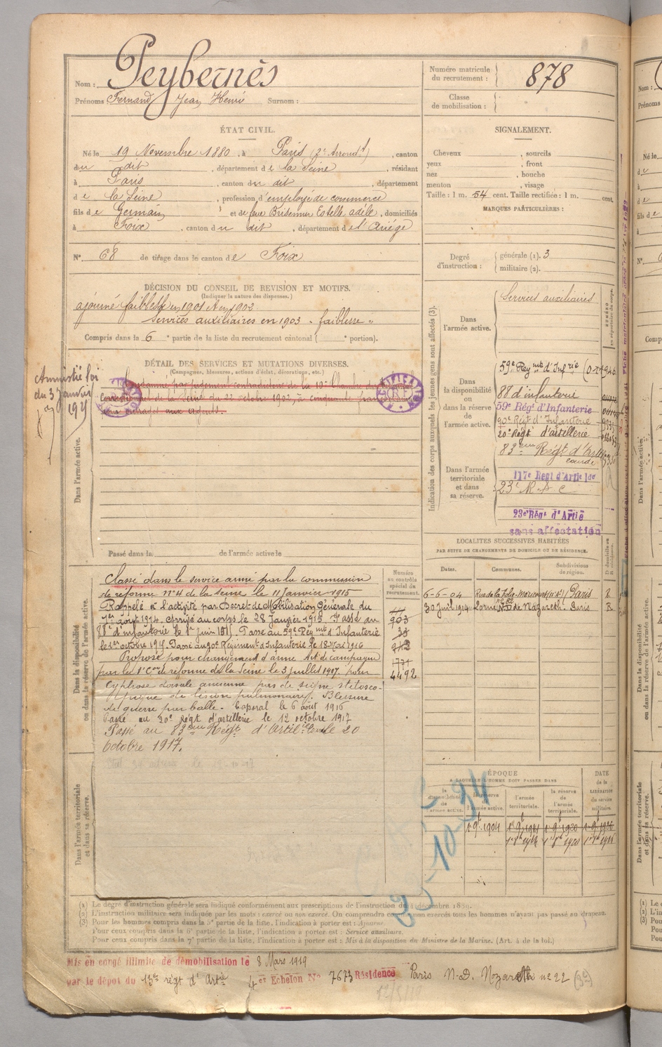 | Peybernès | Fernand Jean Henri | FOIX | 129 W 3 | 1900 | Paris | Paris | 878 |
