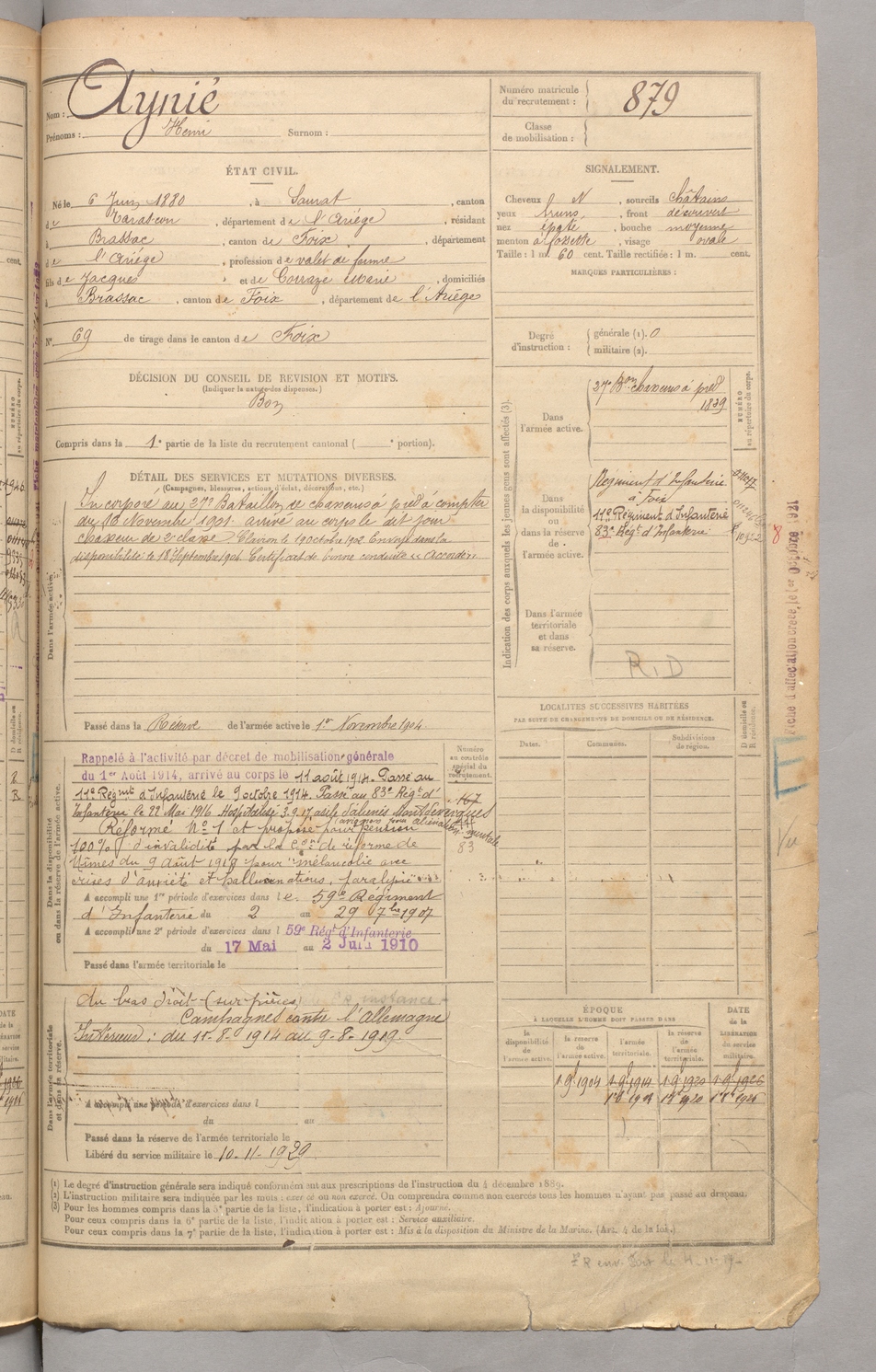 | Aynié | Henri | FOIX | 129 W 3 | 1900 | Saurat | Brassac | 879 |