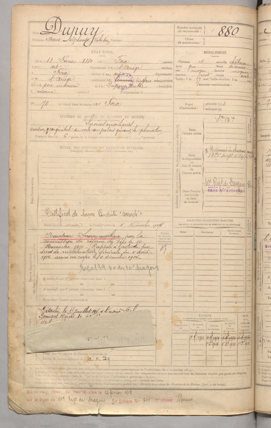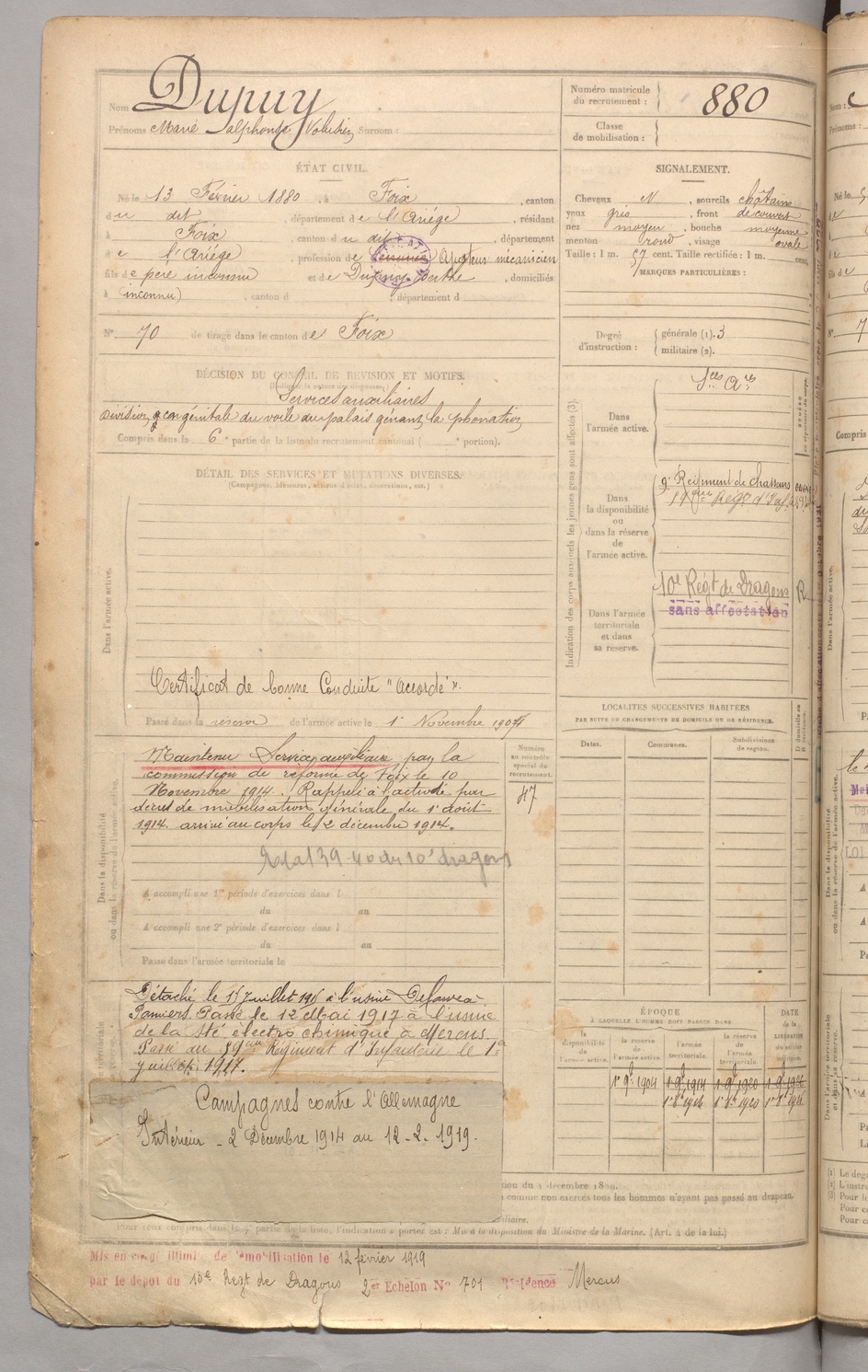| Dupuy | Marie Alphonse Volusien | FOIX | 129 W 3 | 1900 | Foix | Foix | 880 |