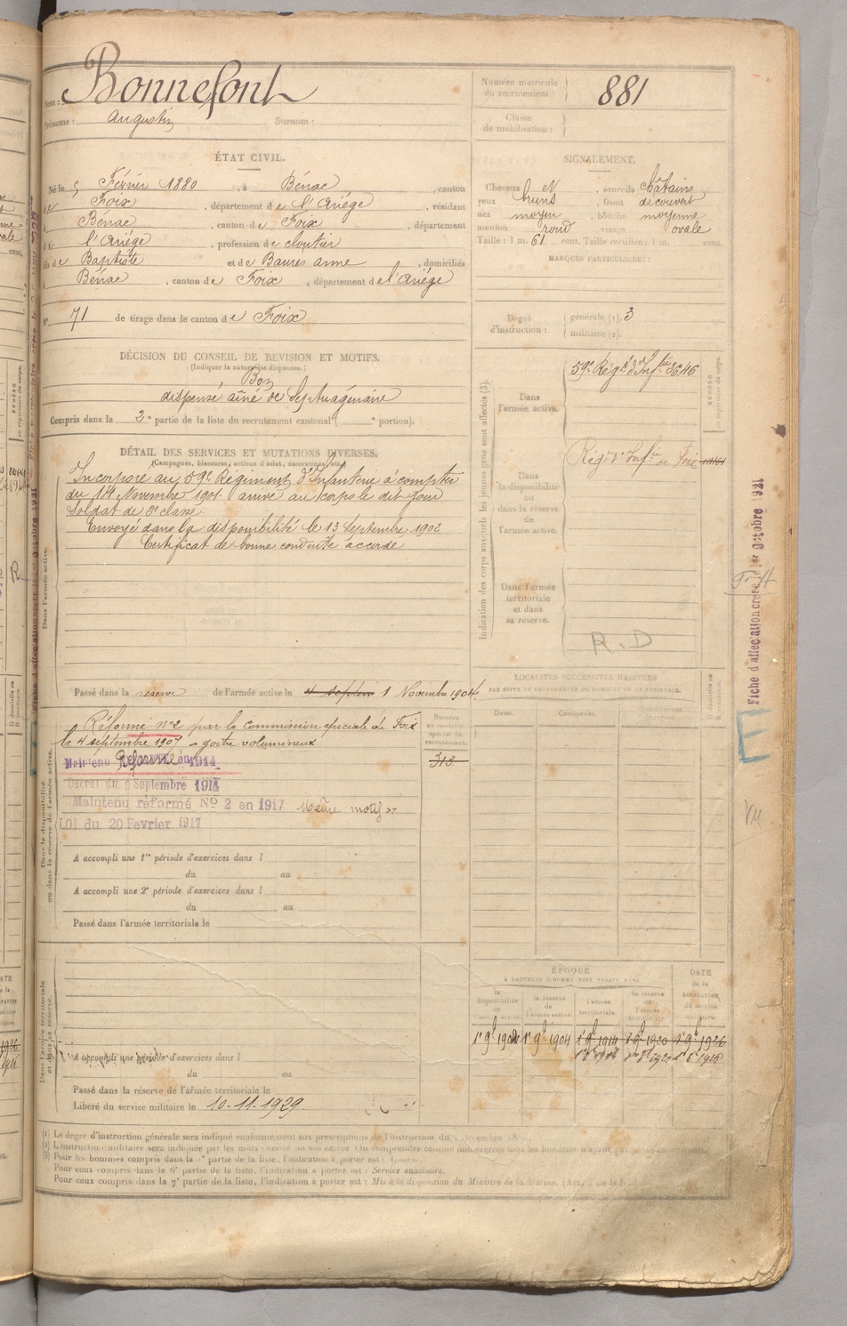 | Bonnefont | Augustin | FOIX | 129 W 3 | 1900 | Bénac | Bénac | 881 |