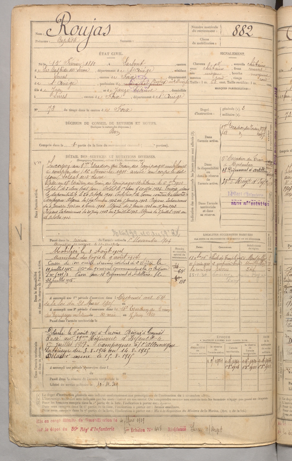 | Roujas | Baptiste | FOIX | 129 W 3 | 1900 | Larbont | Serres-sur-Arget | 882 |