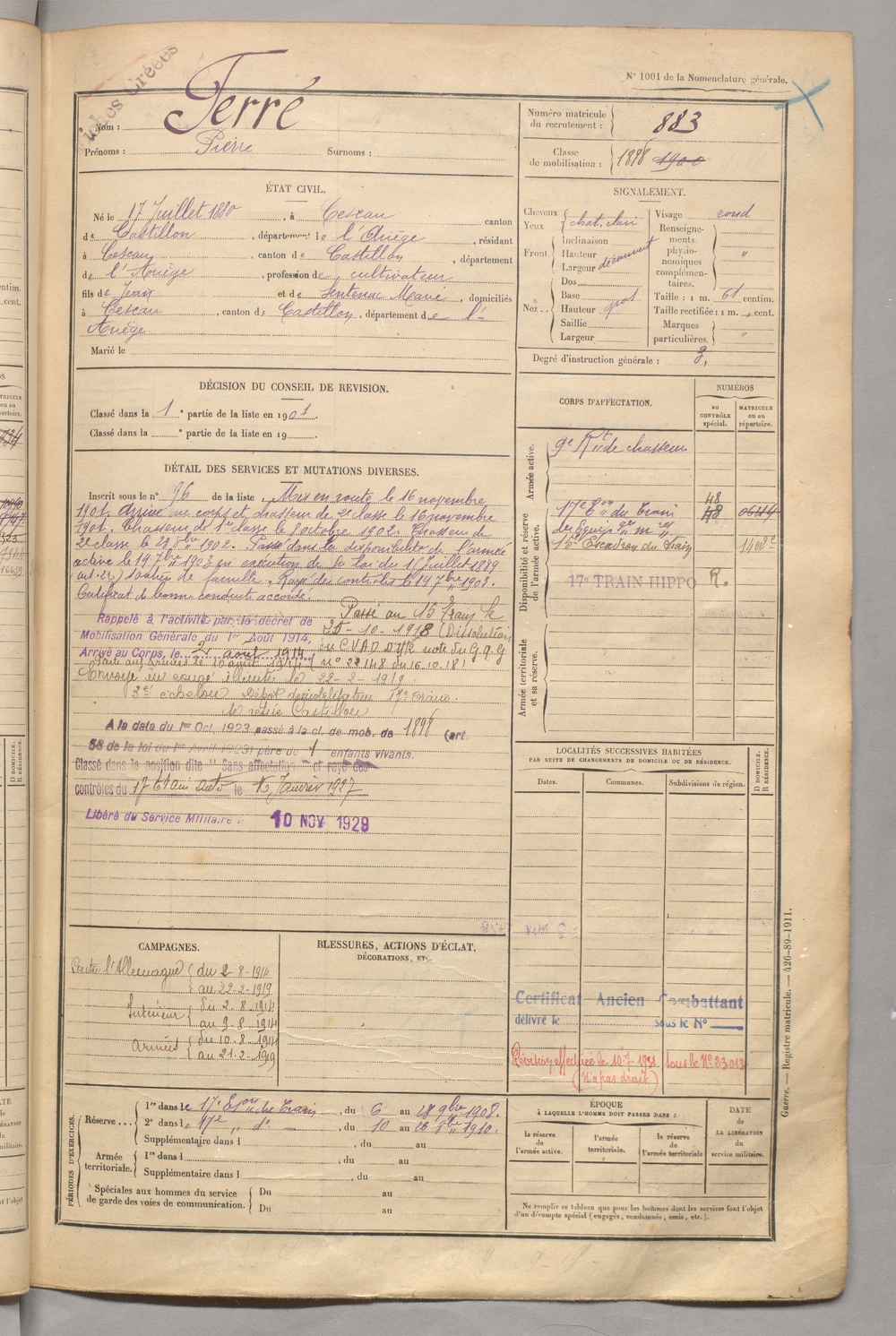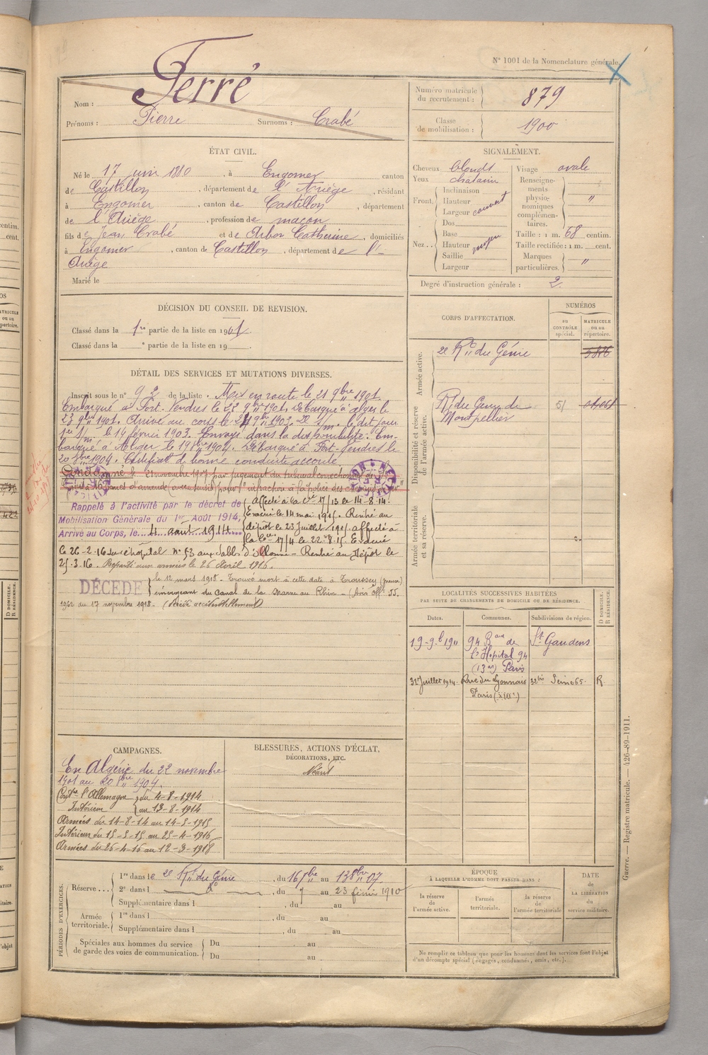 | Ferré | Pierre dit Crabé | FOIX | 129 W 5 | 1900 | Engomer | Engomer | 879 |