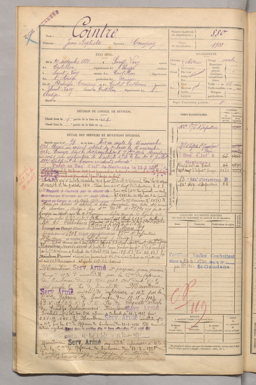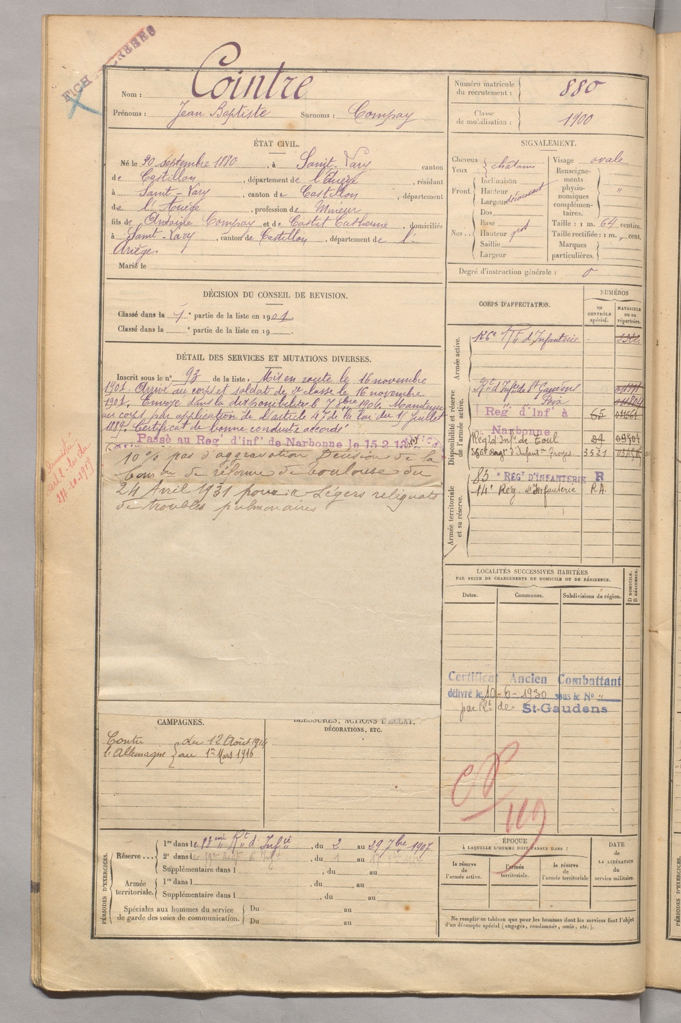 | Cointre | Jean Baptiste dit Compay | FOIX | 129 W 5 | 1900 | Saint-Lary | Saint-Lary | 880 |
