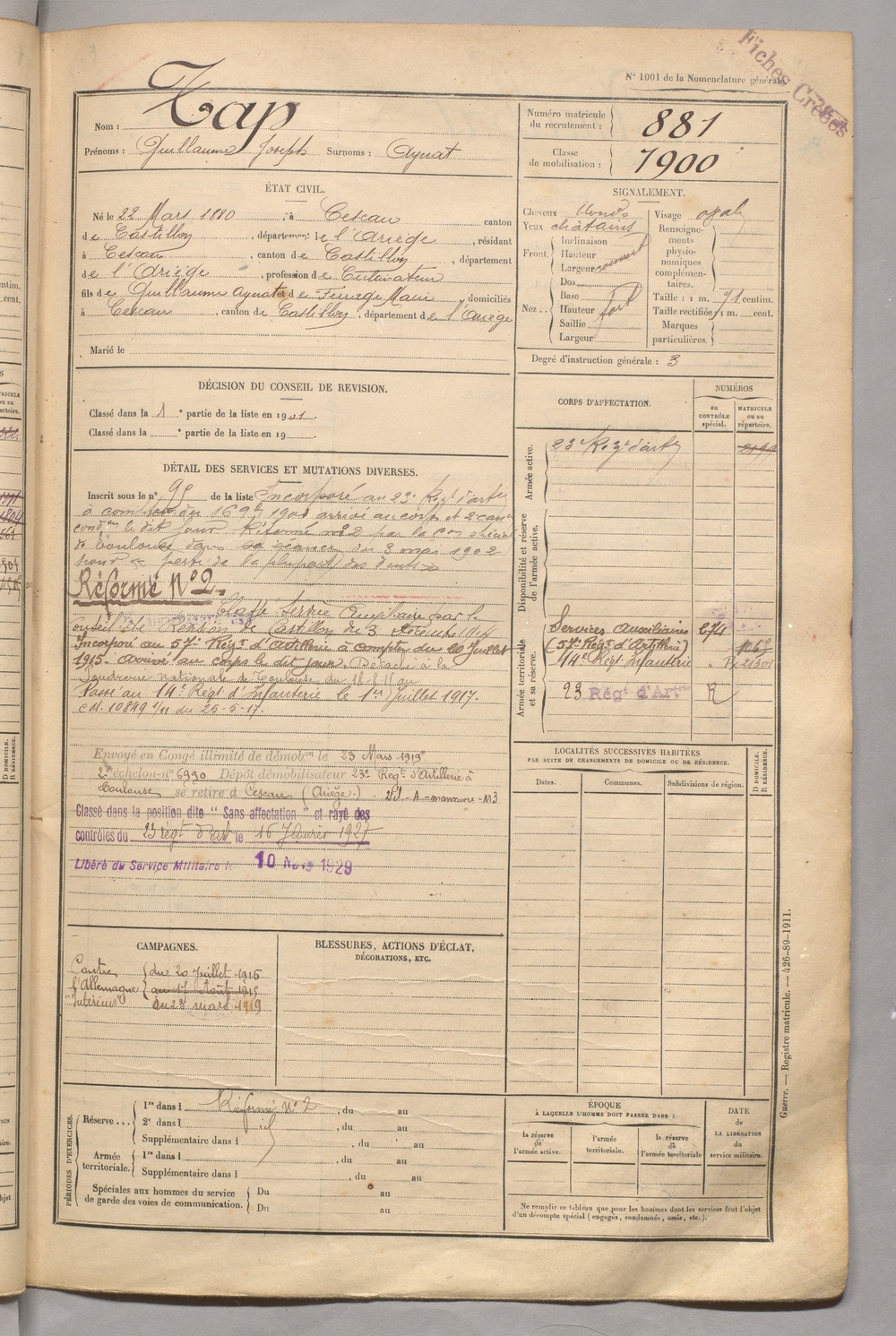 | Tap | Guillaume Joseph dit Aynat | FOIX | 129 W 5 | 1900 | Cescau | Cescau | 881 |
