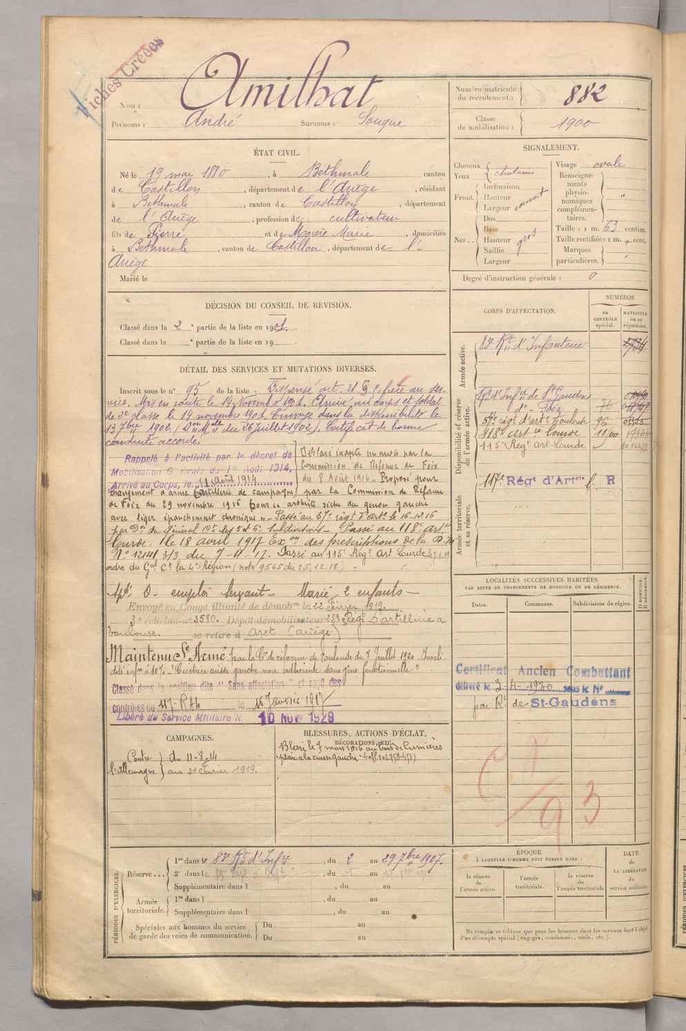| Amilhat | André dit Souque | FOIX | 129 W 5 | 1900 | Bethmale | Bethmale | 882 |
