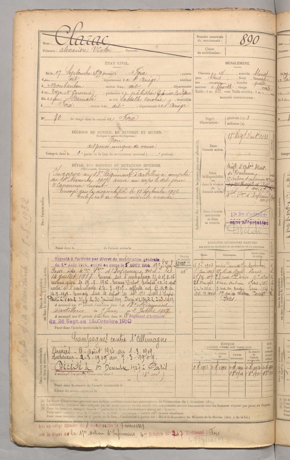 | Clarac | Alexandre Victor | FOIX | 129 W 3 | 1900 | Foix | Montauban | 890 |