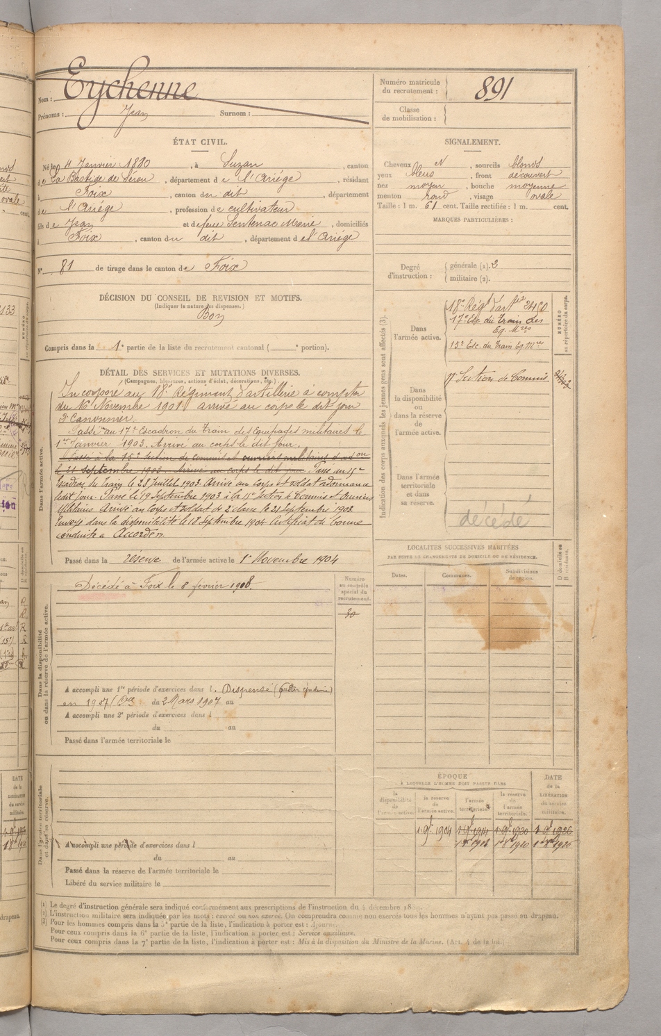 | Eychenne | Jean | FOIX | 129 W 3 | 1900 | Suzan | Foix | 891 |
