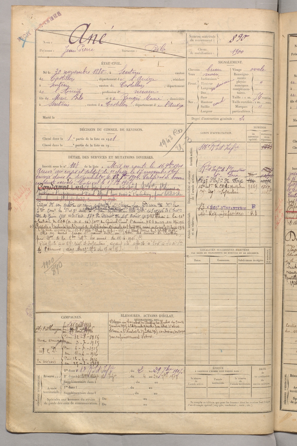 | Ané | Jean Pierre dit Bilo | FOIX | 129 W 5 | 1900 | Sentein | Sentein | 890 |