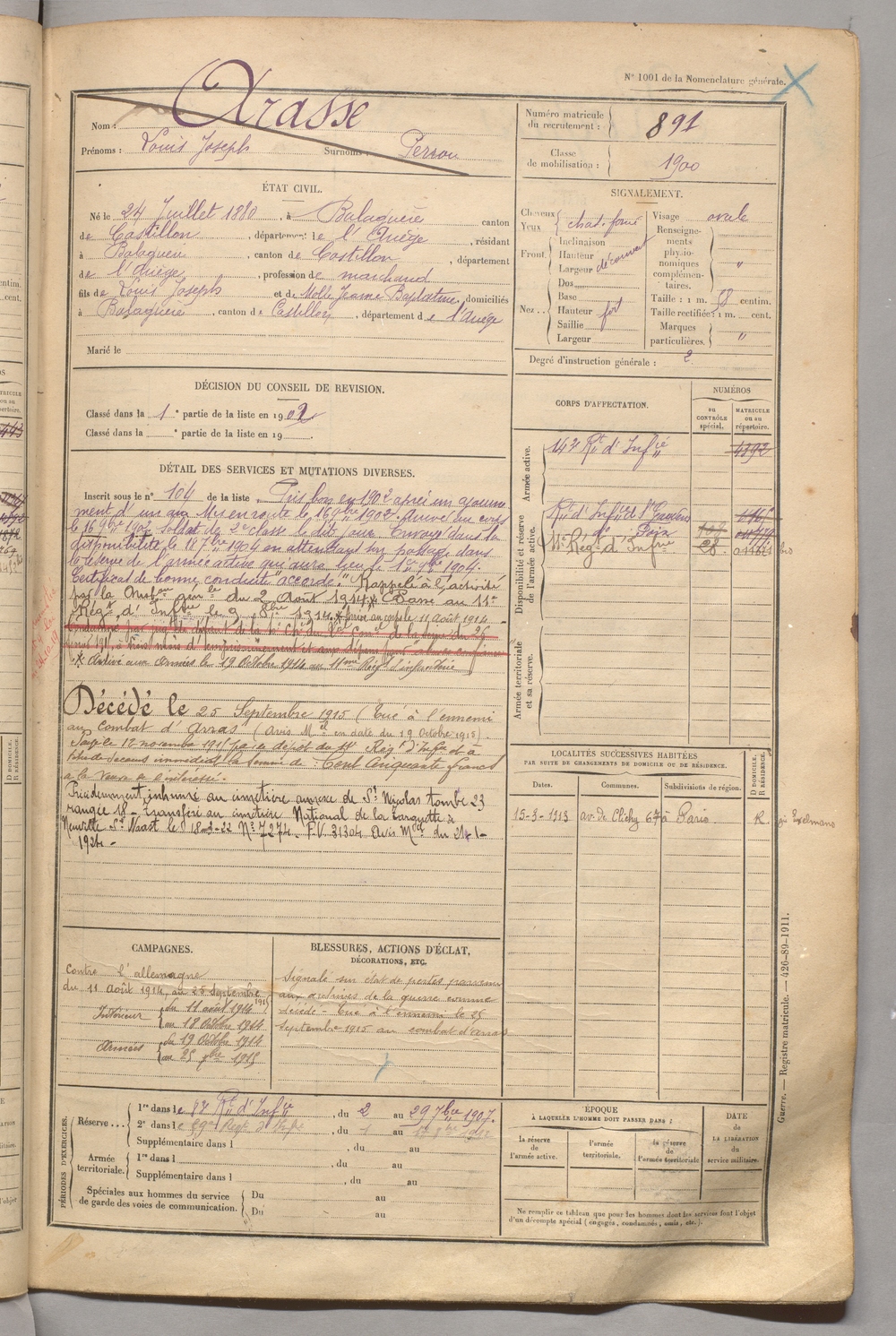 | Arasse | Louis Joseph dit Perrou | FOIX | 129 W 5 | 1900 | Balaguères | Balaguères | 891 |