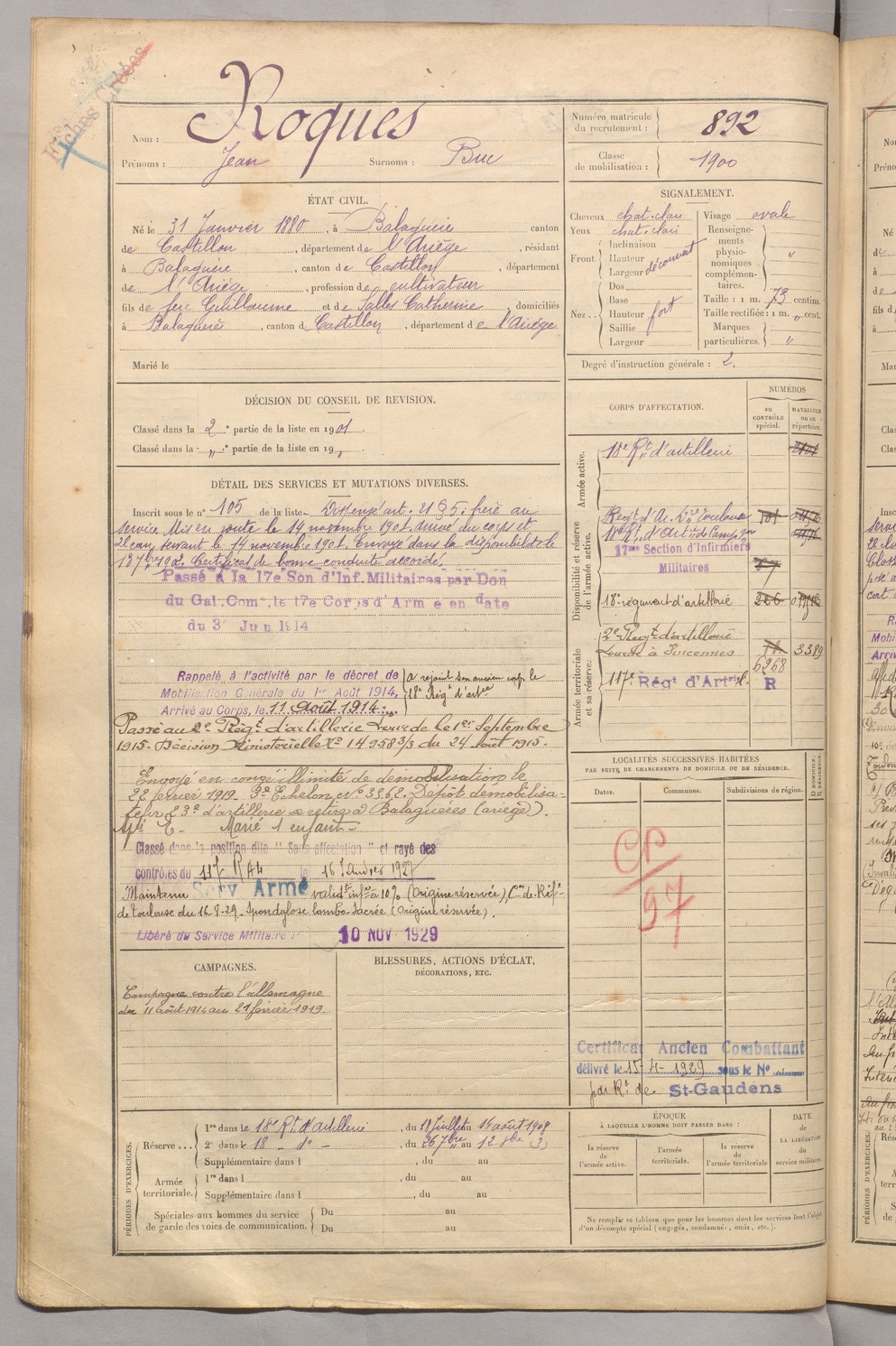 | Roques | Jean dit Buc | FOIX | 129 W 5 | 1900 | Balaguères | Balaguères | 892 |