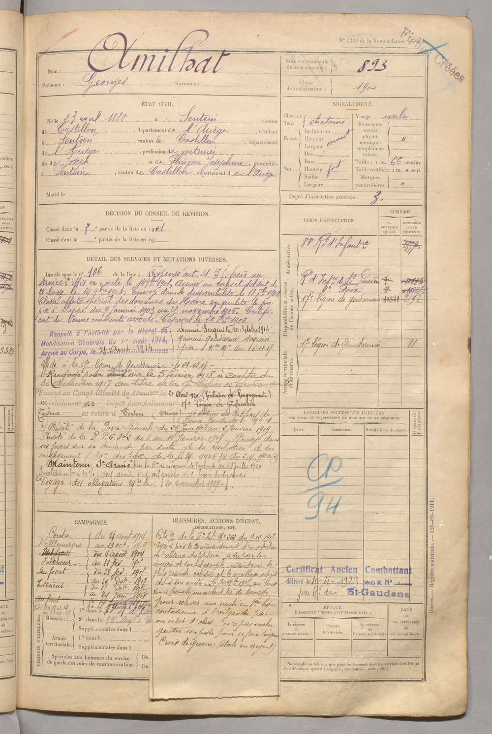 | Amilhat | Georges | FOIX | 129 W 5 | 1900 | Sentein | Sentein | 893 |