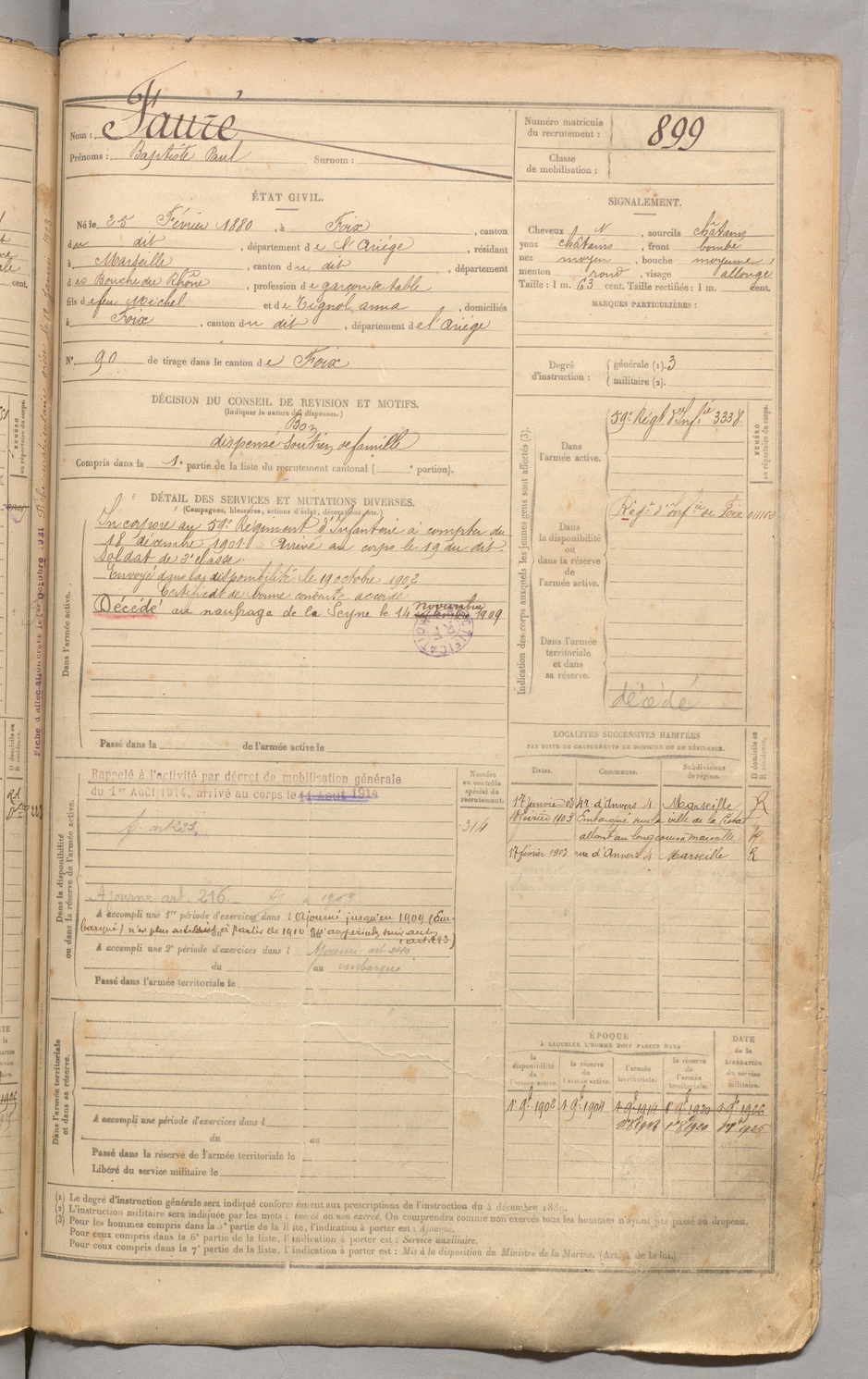 | Fauré | Baptiste Paul | FOIX | 129 W 3 | 1900 | Foix | Marseille | 899 |
