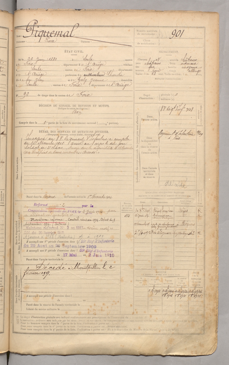 | Piquemal | Pierre | FOIX | 129 W 3 | 1900 | Soula | Soula | 901 |