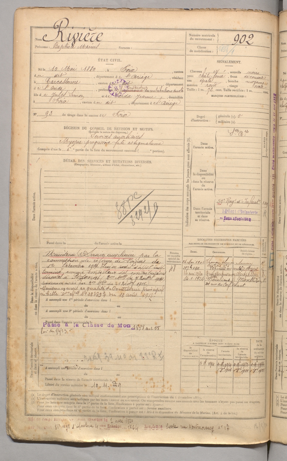 | Rivière | Baptiste Marius | FOIX | 129 W 3 | 1900 | Foix | Carcassonne | 902 |