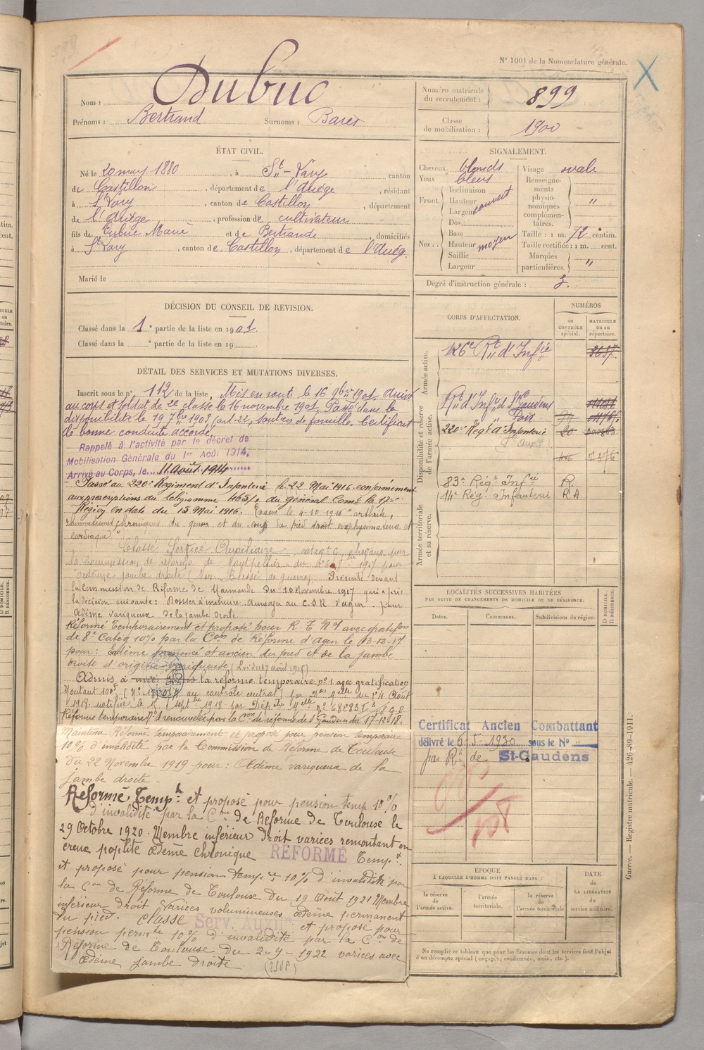 | Dubuc | Bertrand dit Baret | FOIX | 129 W 5 | 1900 | Saint-Lary | Saint-Lary | 899 |