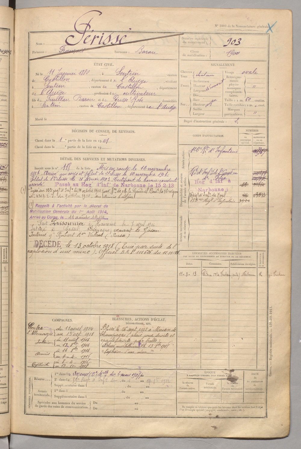 | Périssé | François dit Barau | FOIX | 129 W 5 | 1900 | Sentein | Sentein | 903 |