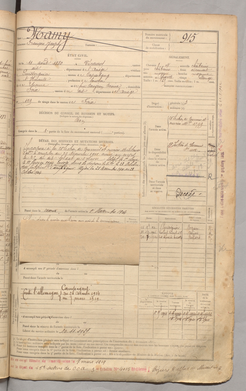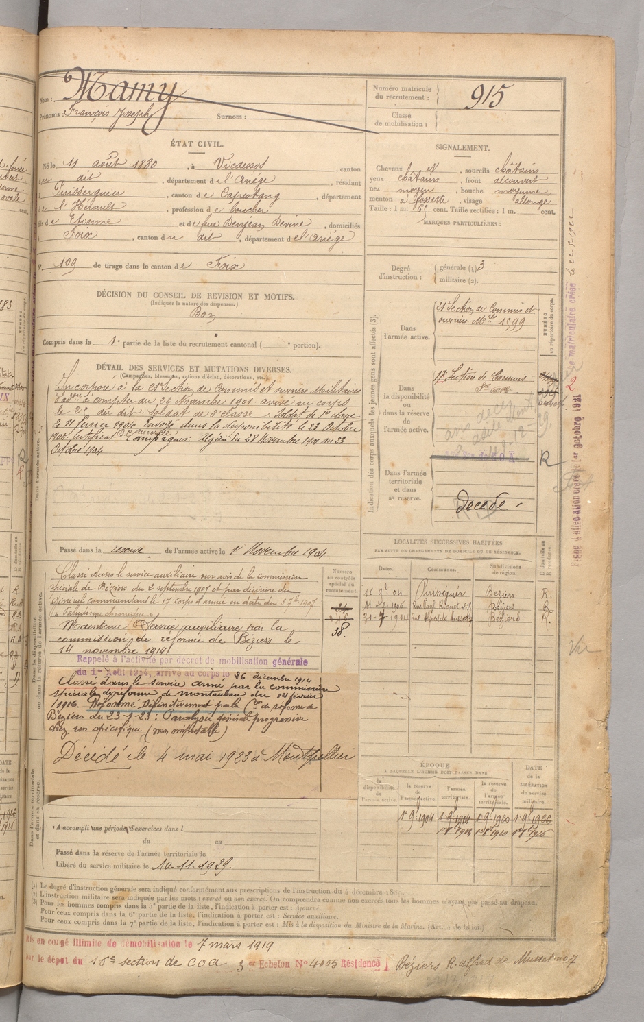 | Mamy | François Joseph | FOIX | 129 W 3 | 1900 | Vicdessos | Puisserguier | 915 |