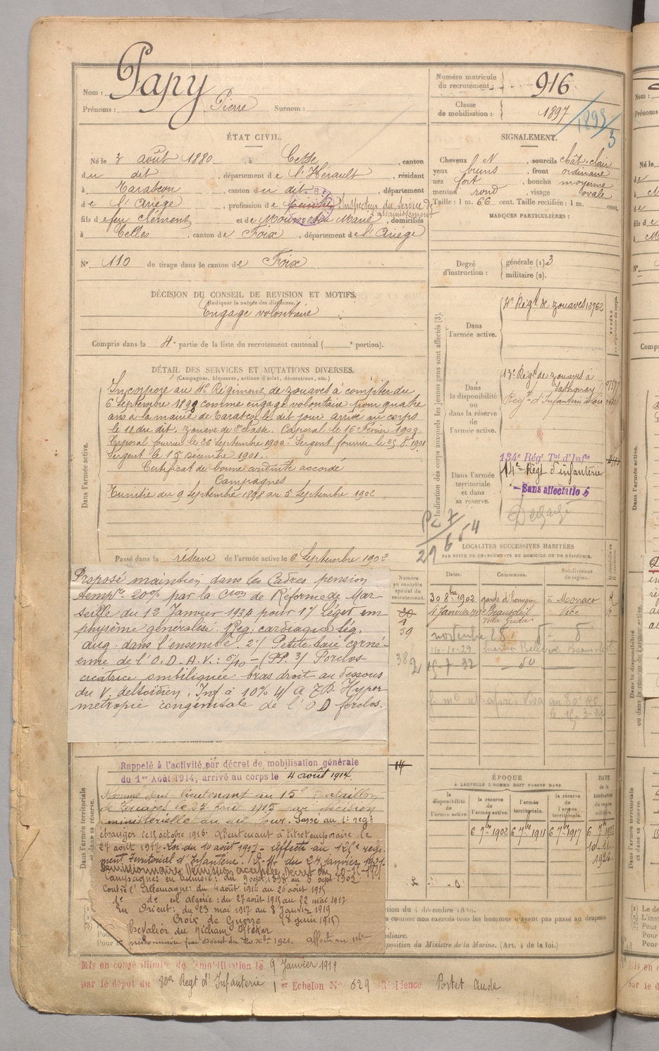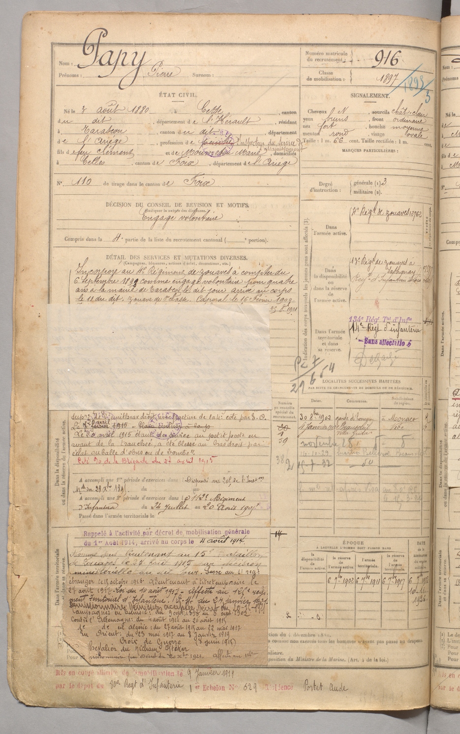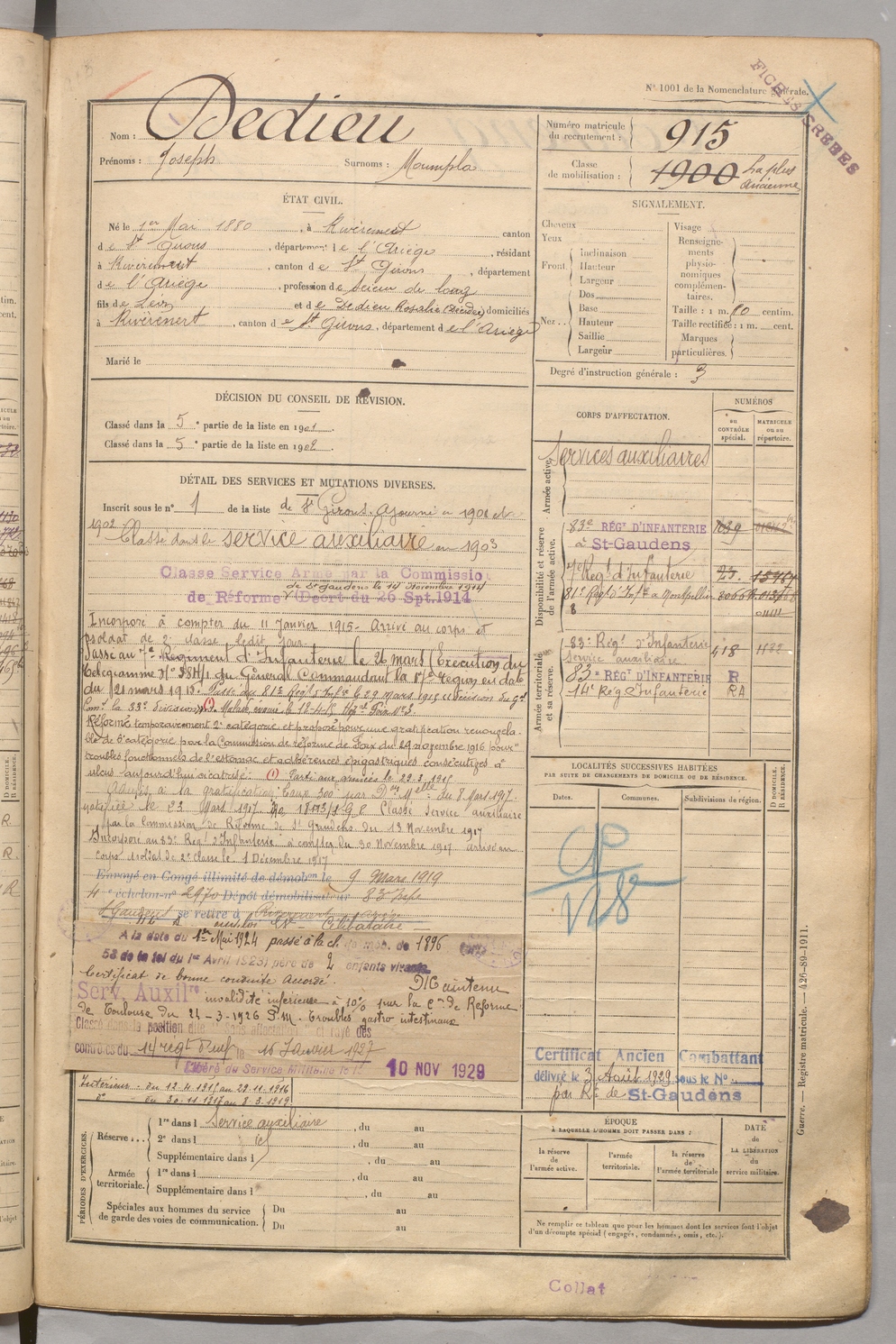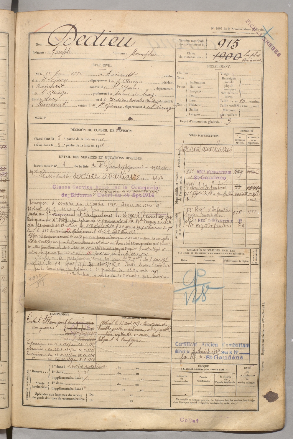 | Dedieu | Joseph dit Moumpla | FOIX | 129 W 5 | 1900 | Rivèrenert | Rivèrenert | 915 |