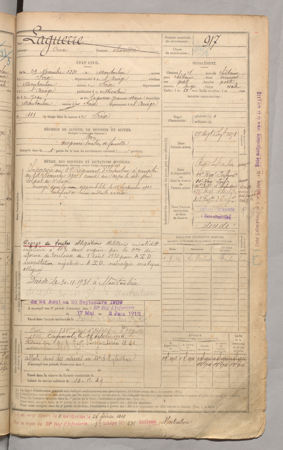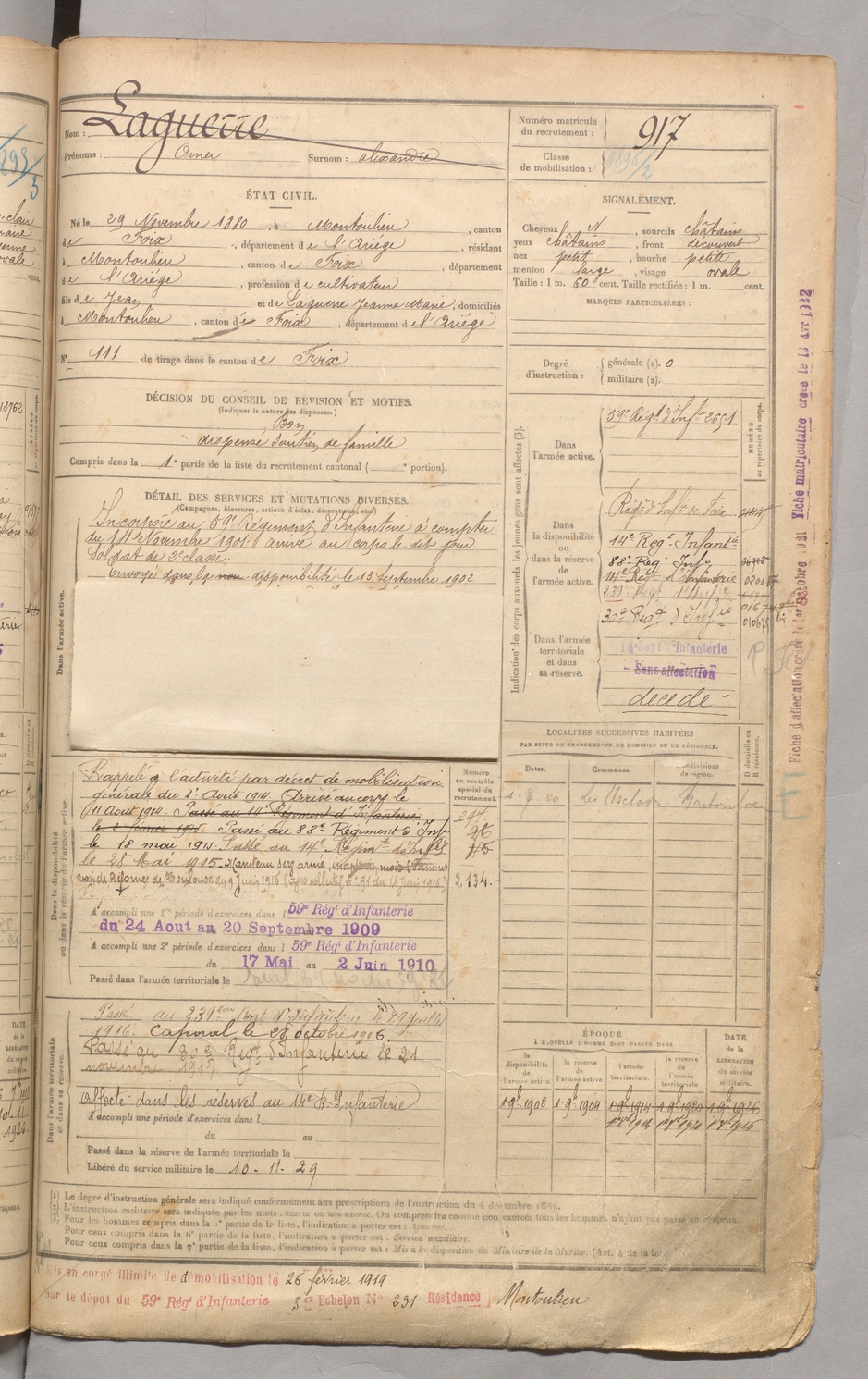 | Laguerre | Omer dit Alexandre | FOIX | 129 W 3 | 1900 | Montoulieu | Montoulieu | 917 |