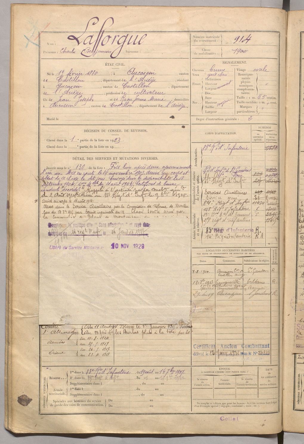 | Lafforgue | Charles Benjamin | FOIX | 129 W 5 | 1900 | Aucazein | Aucazein | 914 |
