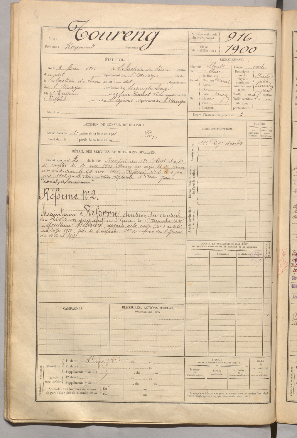 | Toureng | Raymond | FOIX | 129 W 5 | 1900 | Bastide-de-Sérou (La) | Bastide-de-Sérou (La) | 916 |
