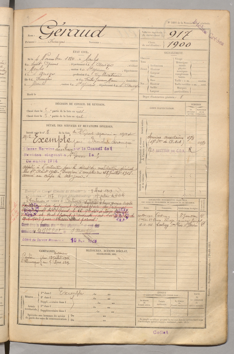 | Géraud | François | FOIX | 129 W 5 | 1900 | Moulis | Moulis | 917 |