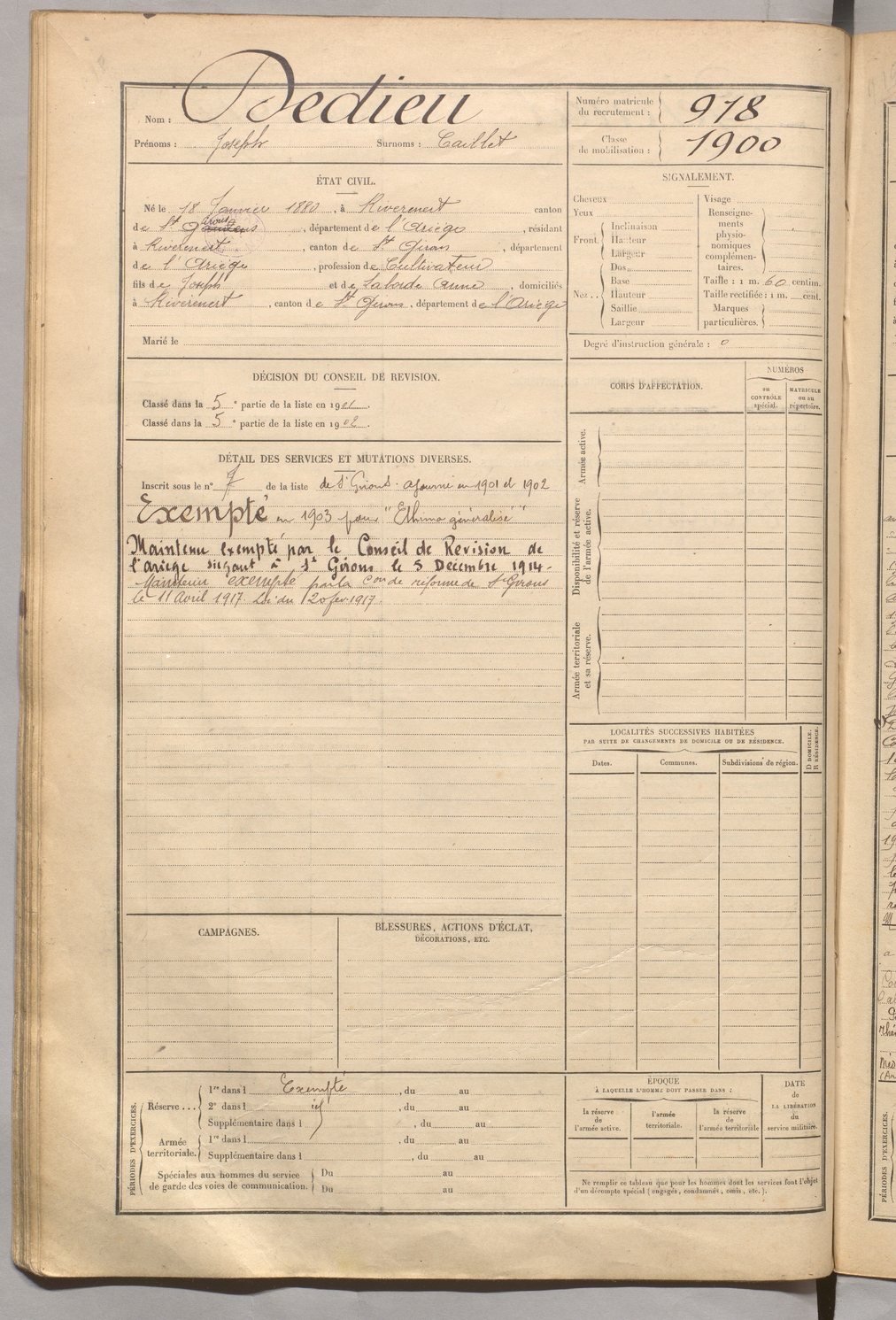| Dedieu | Joseph dit Caillet | FOIX | 129 W 5 | 1900 | Rivèrenert | Rivèrenert | 918 |