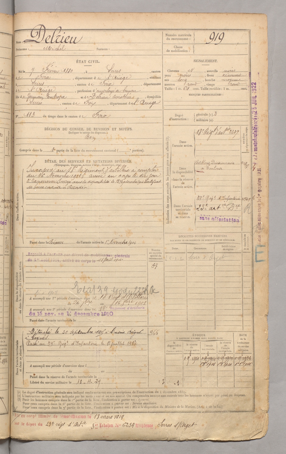 | Delrieu | Michel | FOIX | 129 W 3 | 1900 | Serres-sur-Arget | Serres-sur-Arget | 919 |