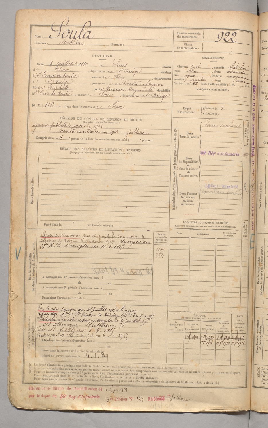 | Soula | Mathieu | FOIX | 129 W 3 | 1900 | Serres-sur-Arget | Saint-Pierre-de-Rivière | 922 |