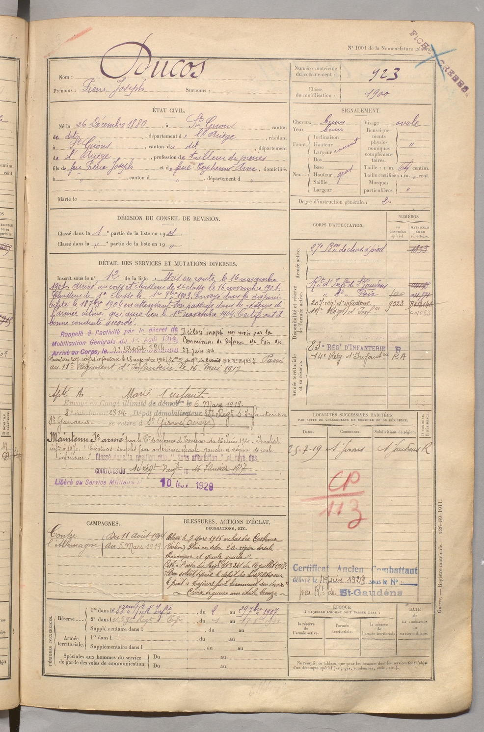 | Ducos | Pierre Joseph | FOIX | 129 W 5 | 1900 | Saint-Girons | Saint-Girons | 923 |