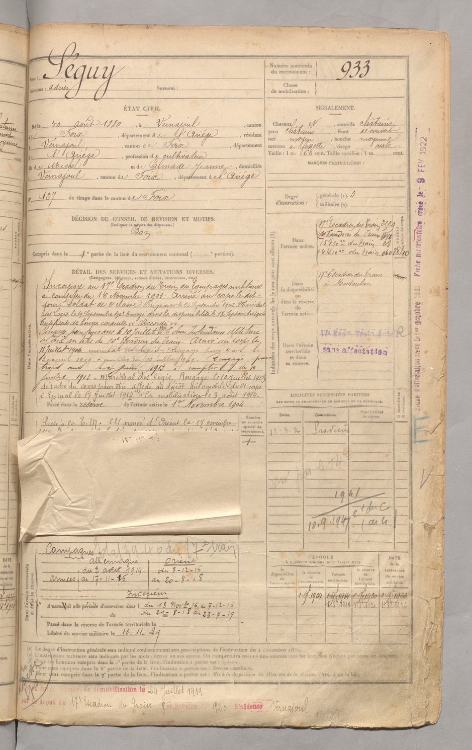 | Séguy | Adrien | FOIX | 129 W 3 | 1900 | Vernajoul | Vernajoul | 933 |