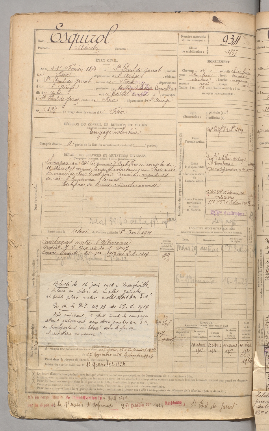 | Esquirol | Ménelor | FOIX | 129 W 3 | 1900 | Saint-Paul-de-Jarrat | Saint-Paul-de-Jarrat | 934 |
