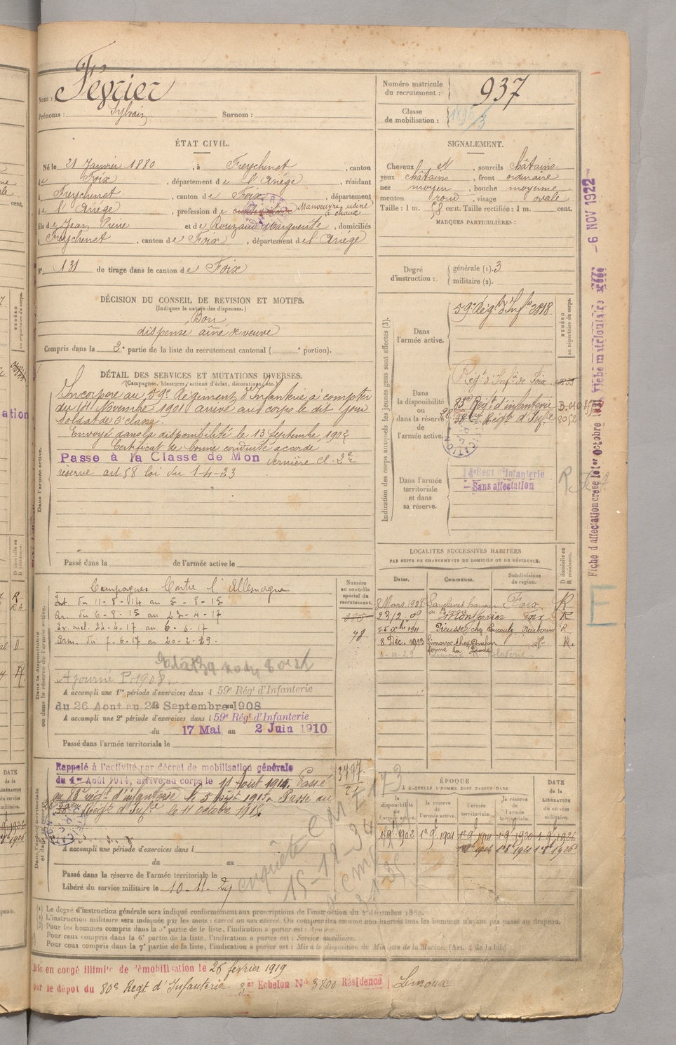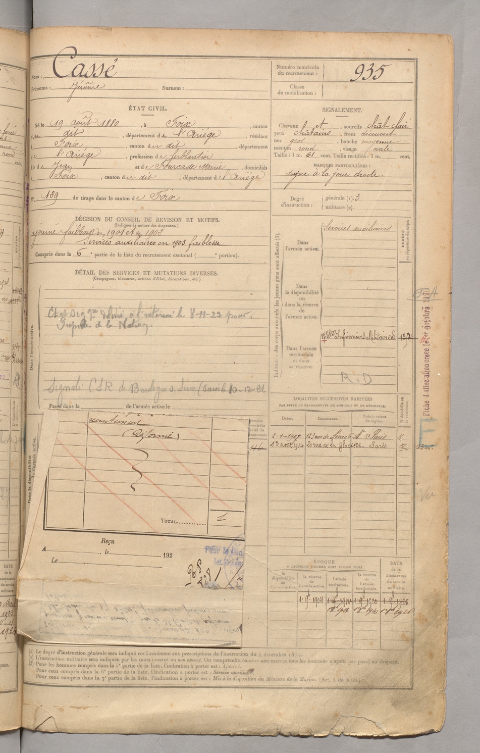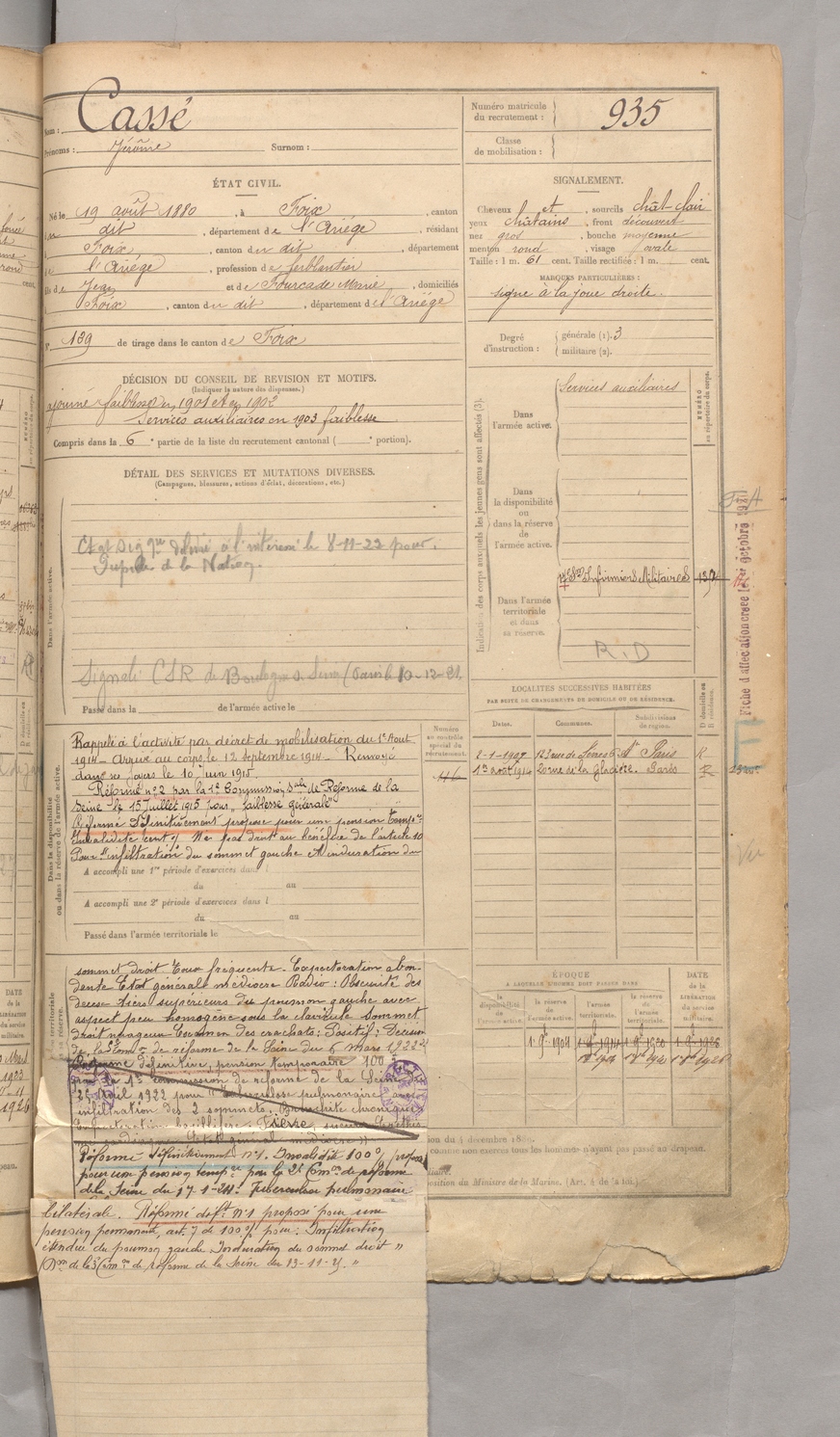 | Cassé | Jérôme | FOIX | 129 W 3 | 1900 | Foix | Foix | 935 |