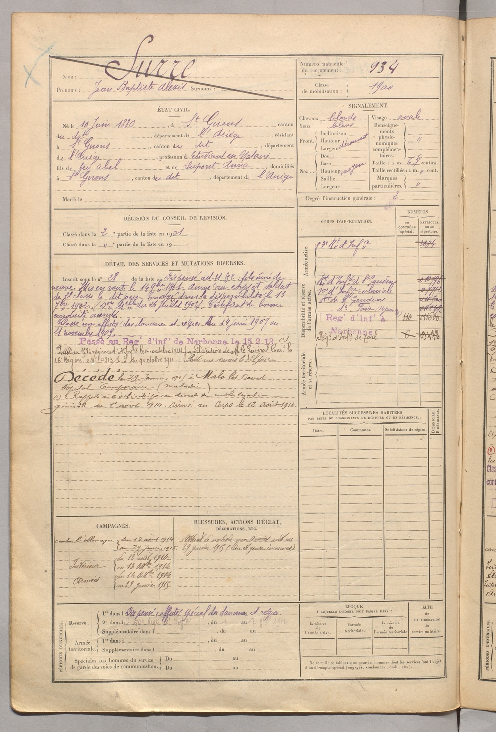 | Surre | Jean Baptiste Alexis | FOIX | 129 W 5 | 1900 | Saint-Girons | Saint-Girons | 934 |