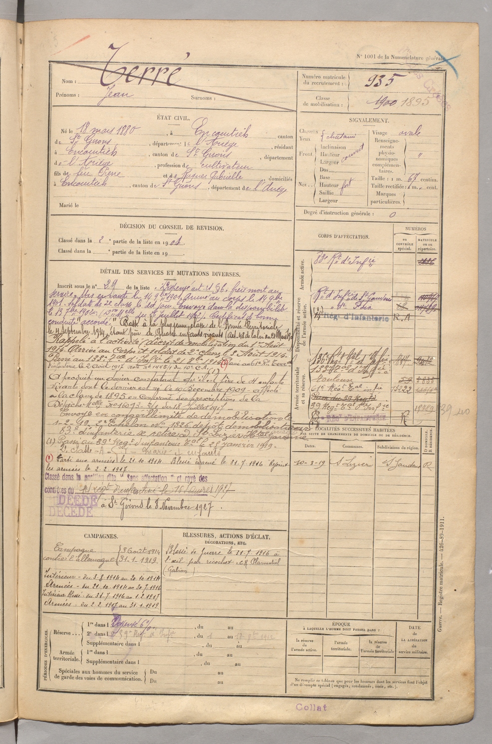 | Terré | Jean | FOIX | 129 W 5 | 1900 | Encourtiech | Encourtiech | 935 |