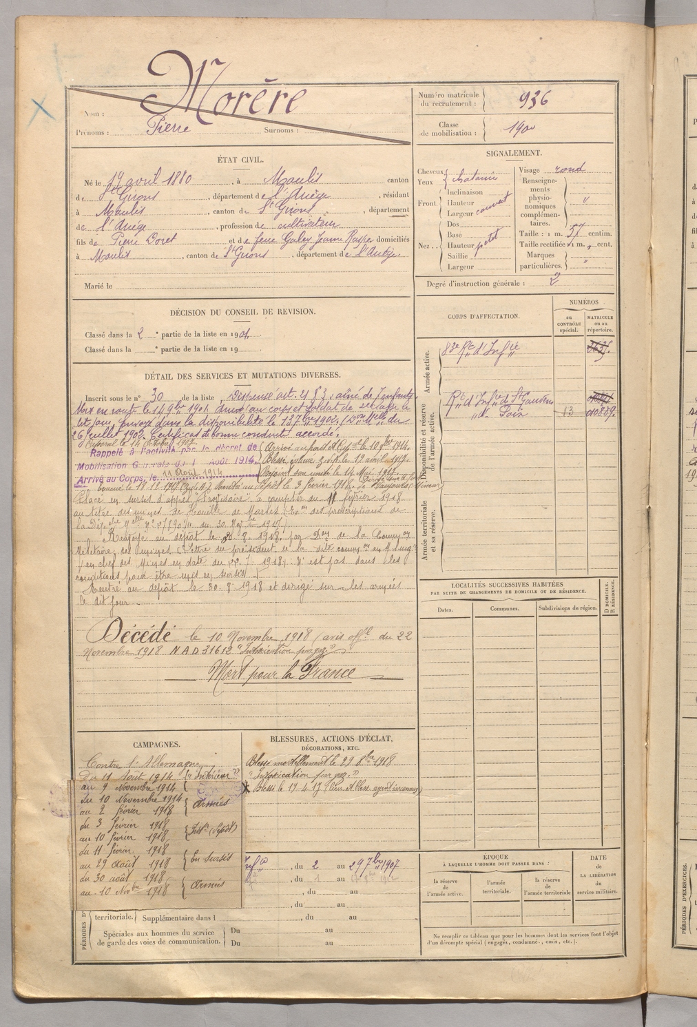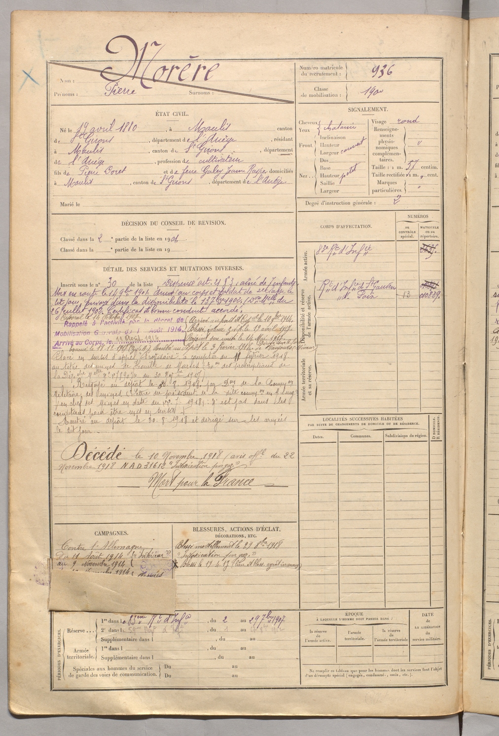 | Morère | Pierre | FOIX | 129 W 5 | 1900 | Moulis | Moulis | 936 |