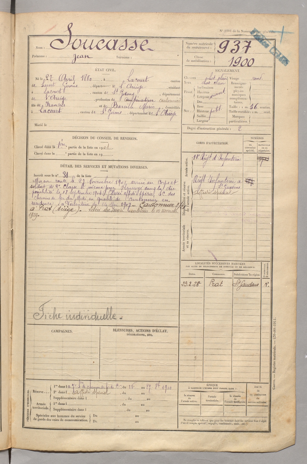 | Soucasse | Jean | FOIX | 129 W 5 | 1900 | Lacourt | Lacourt | 937 |
