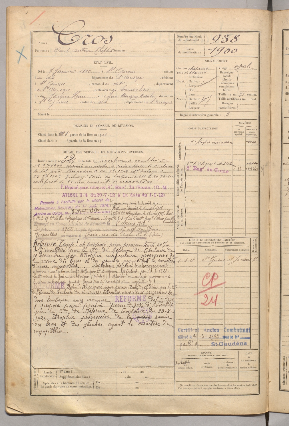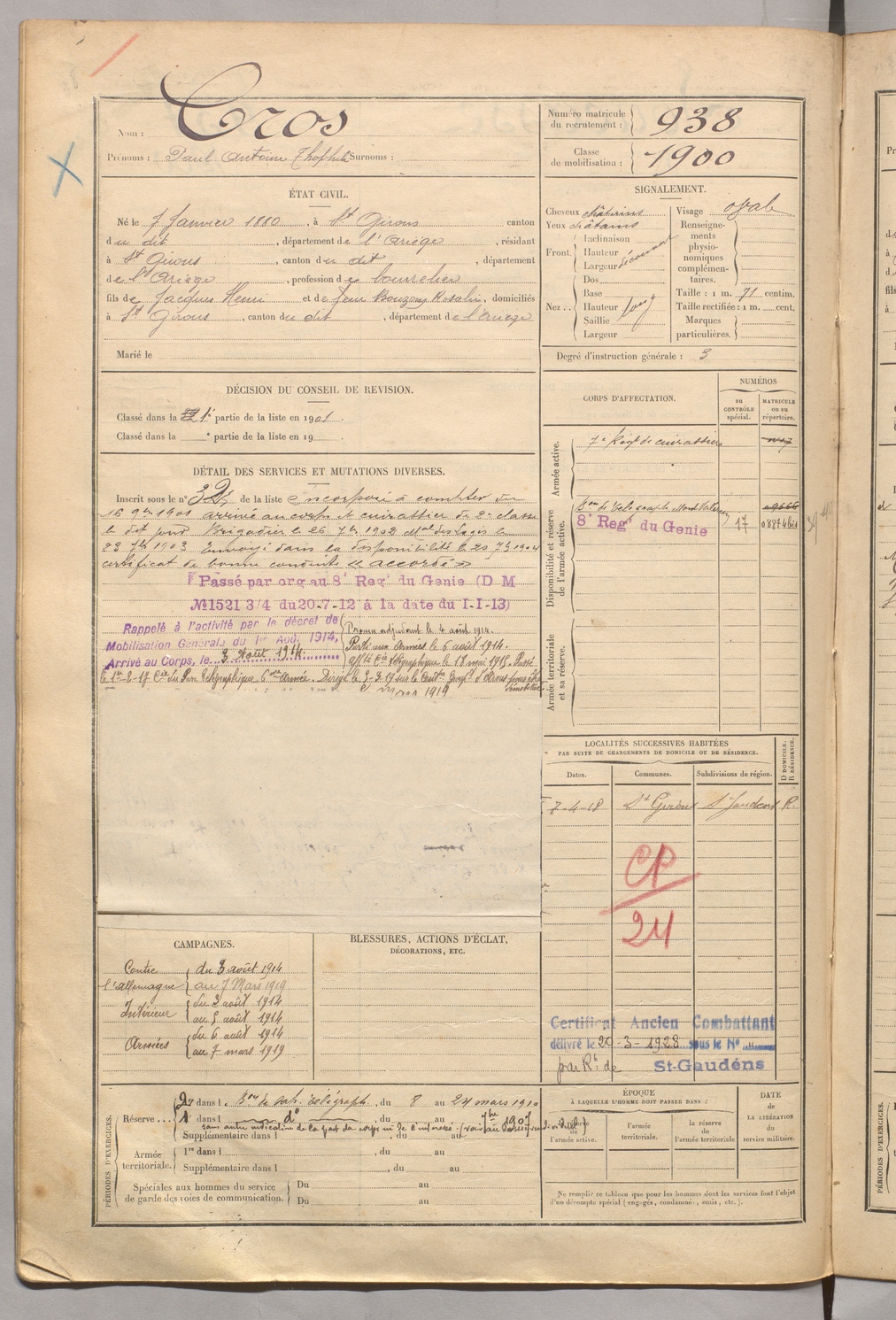| Cros | Paul Antoine Thophile | FOIX | 129 W 5 | 1900 | Saint-Girons | Saint-Girons | 938 |