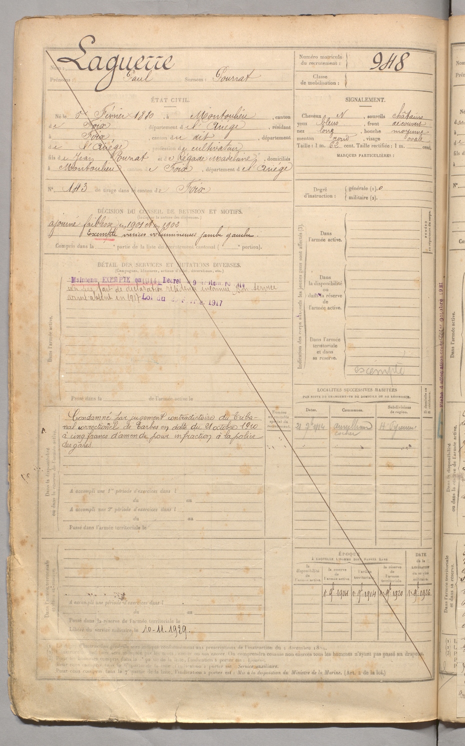 | Laguerre | Paul dit Pourrat | FOIX | 129 W 3 | 1900 | Montoulieu | Foix | 948 |