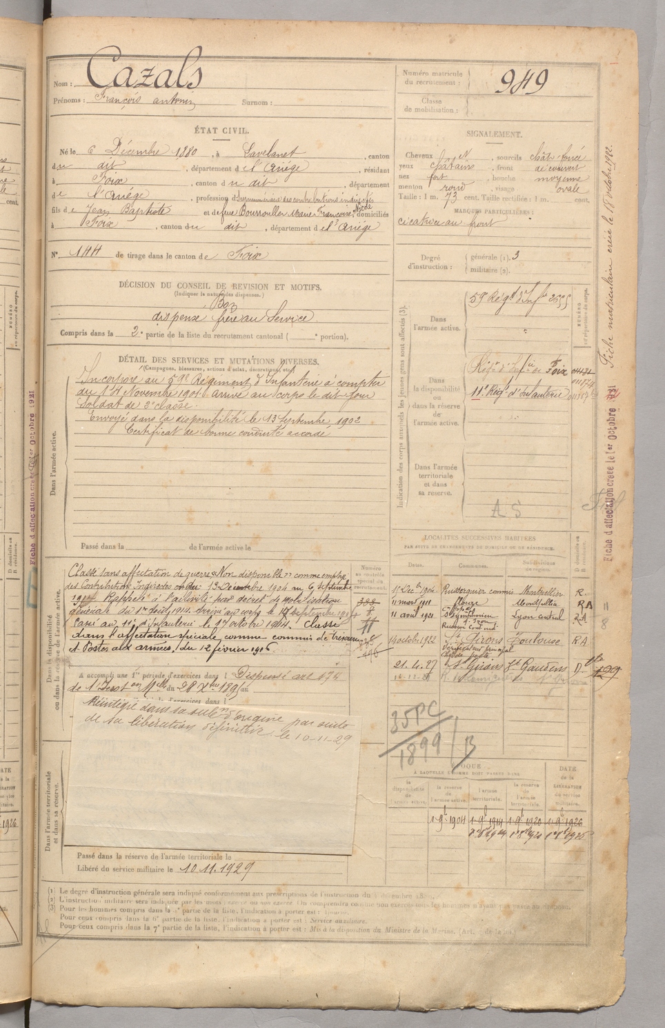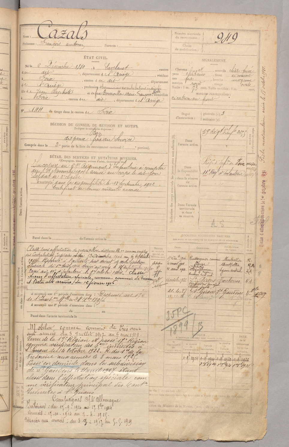 | Cazals | François Antonin | FOIX | 129 W 3 | 1900 | Lavelanet | Foix | 949 |