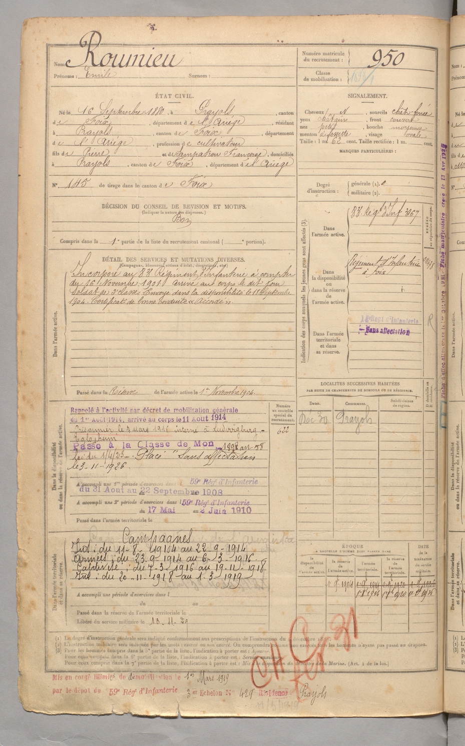 | Roumieu | Emile | FOIX | 129 W 3 | 1900 | Prayols | Prayols | 950 |