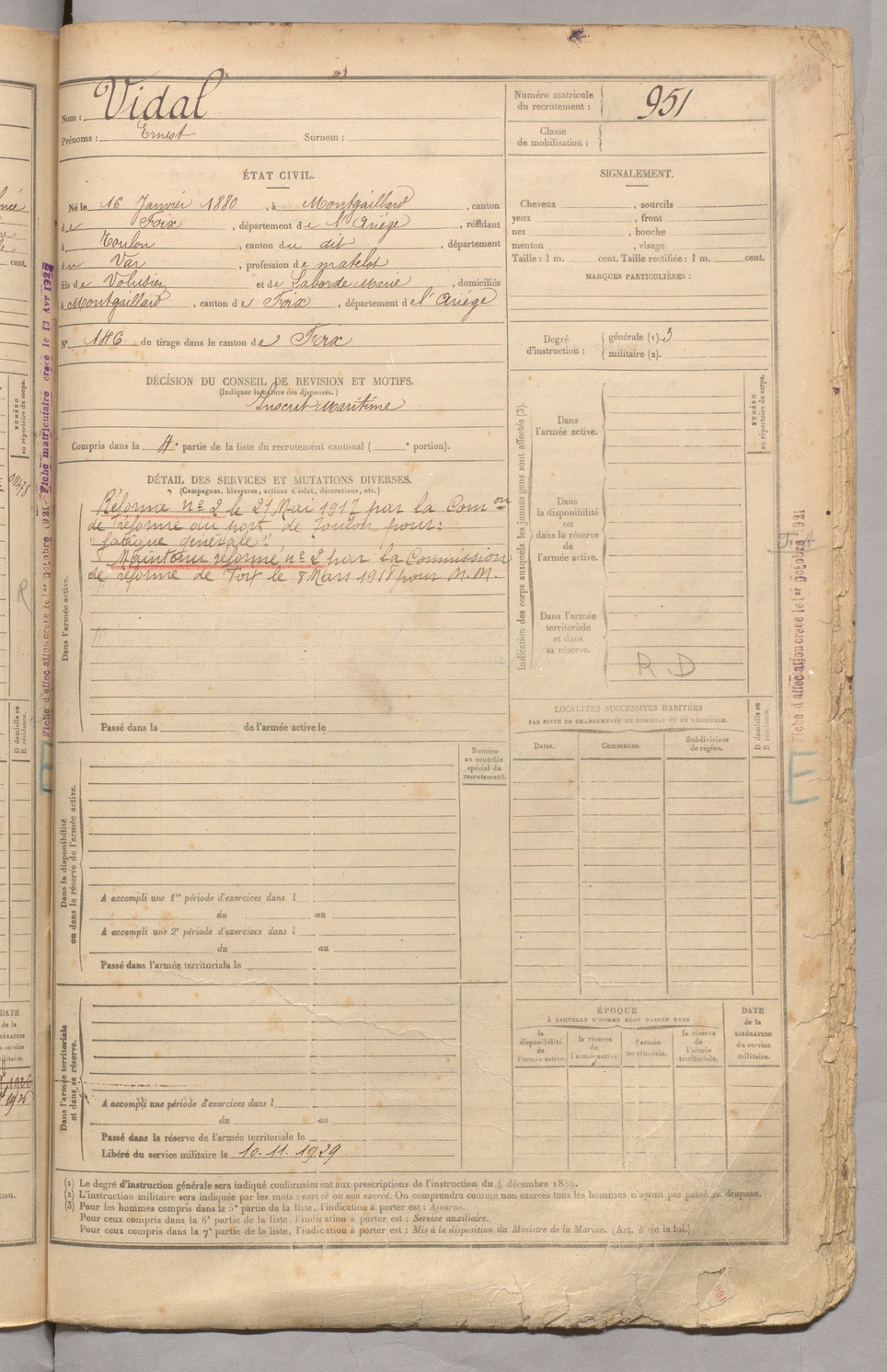 | Vidal | Ernest | FOIX | 129 W 3 | 1900 | Montgailhard | Toulon | 951 |