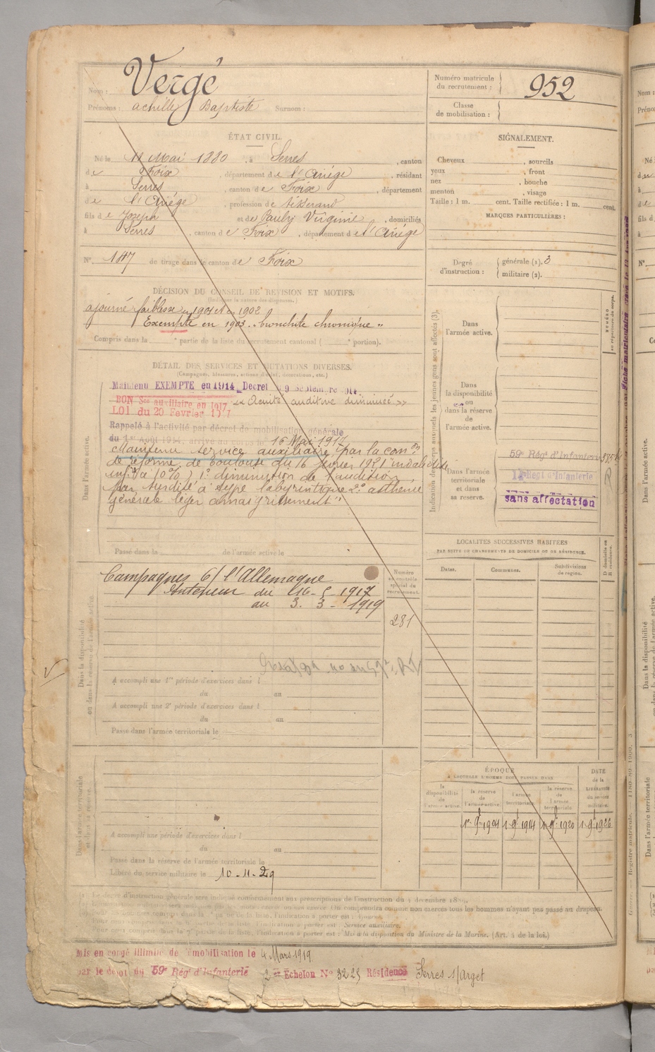 | Vergé | Achille Baptiste | FOIX | 129 W 3 | 1900 | Serres-sur-Arget | Serres-sur-Arget | 952 |