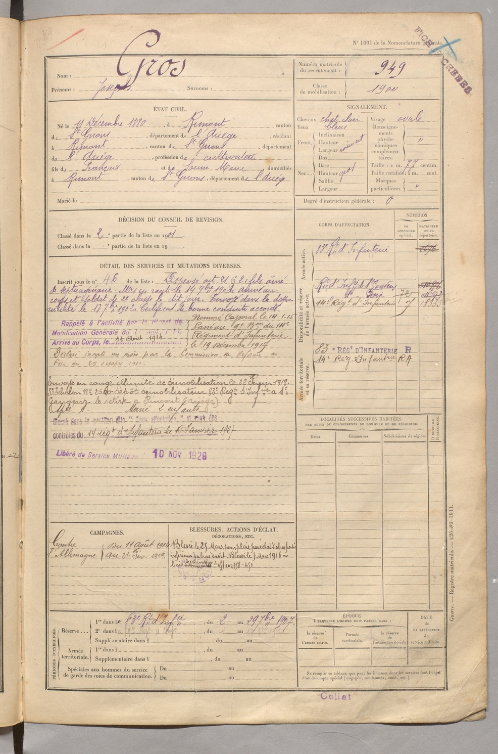 | Gros | Joseph | FOIX | 129 W 5 | 1900 | Rimont | Rimont | 949 |