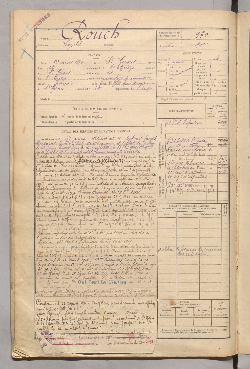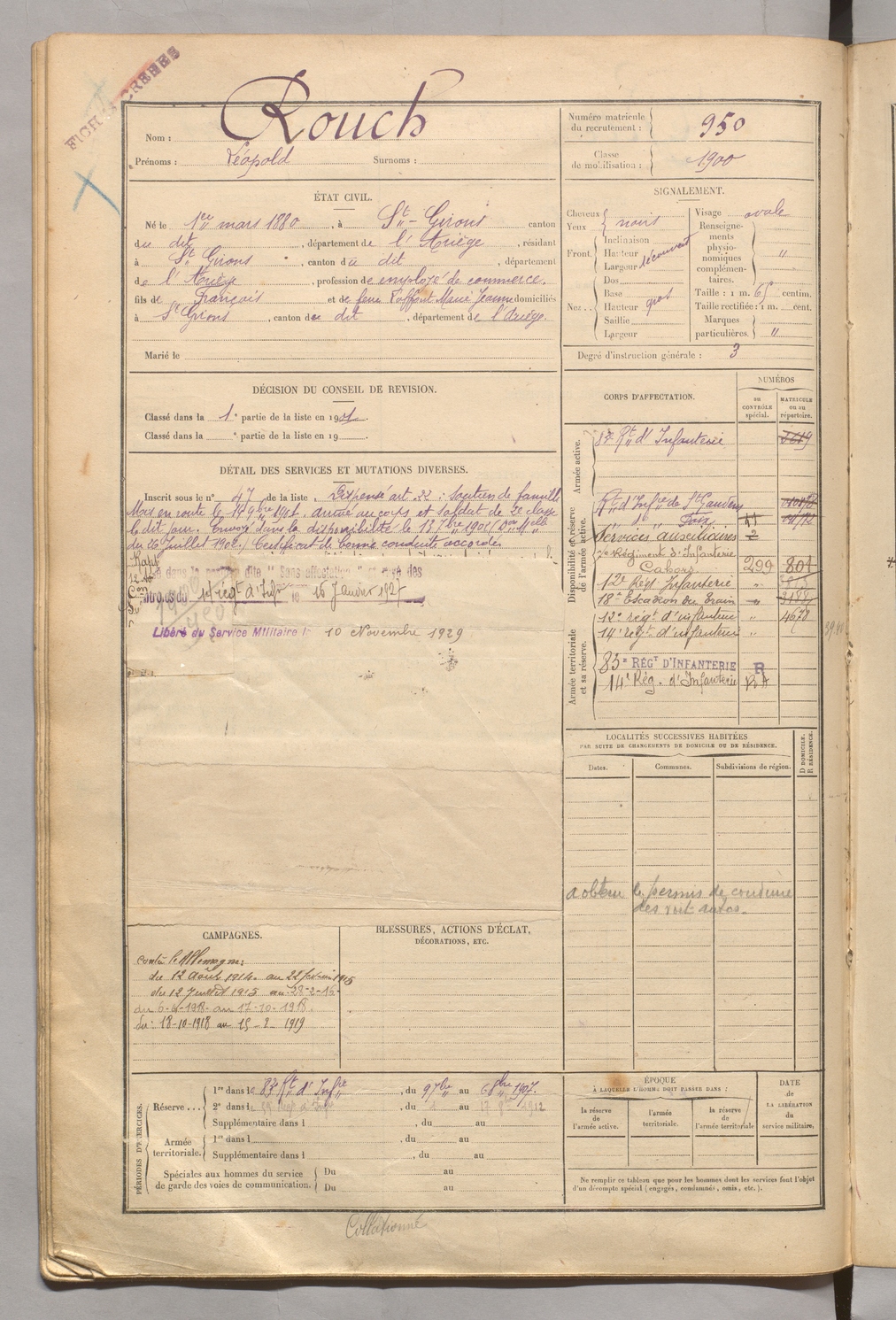 | Rouch | Léopold | FOIX | 129 W 5 | 1900 | Saint-Girons | Saint-Girons | 950 |