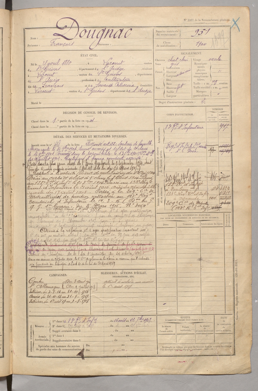 | Dougnac | François | FOIX | 129 W 5 | 1900 | Lacourt | Lacourt | 951 |