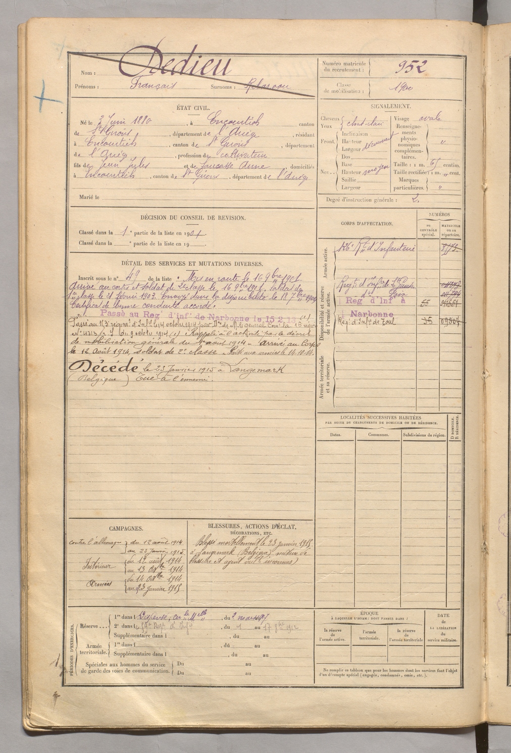 | Dedieu | François dit Rilaroou | FOIX | 129 W 5 | 1900 | Encourtiech | Encourtiech | 952 |