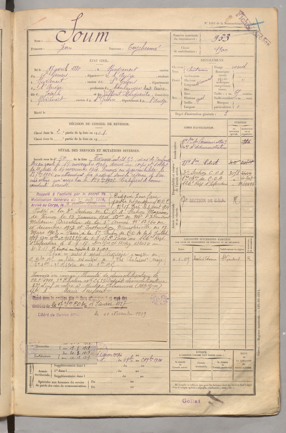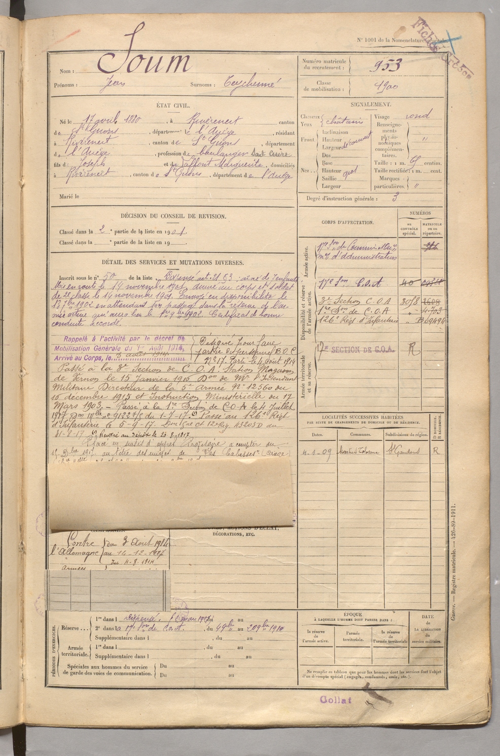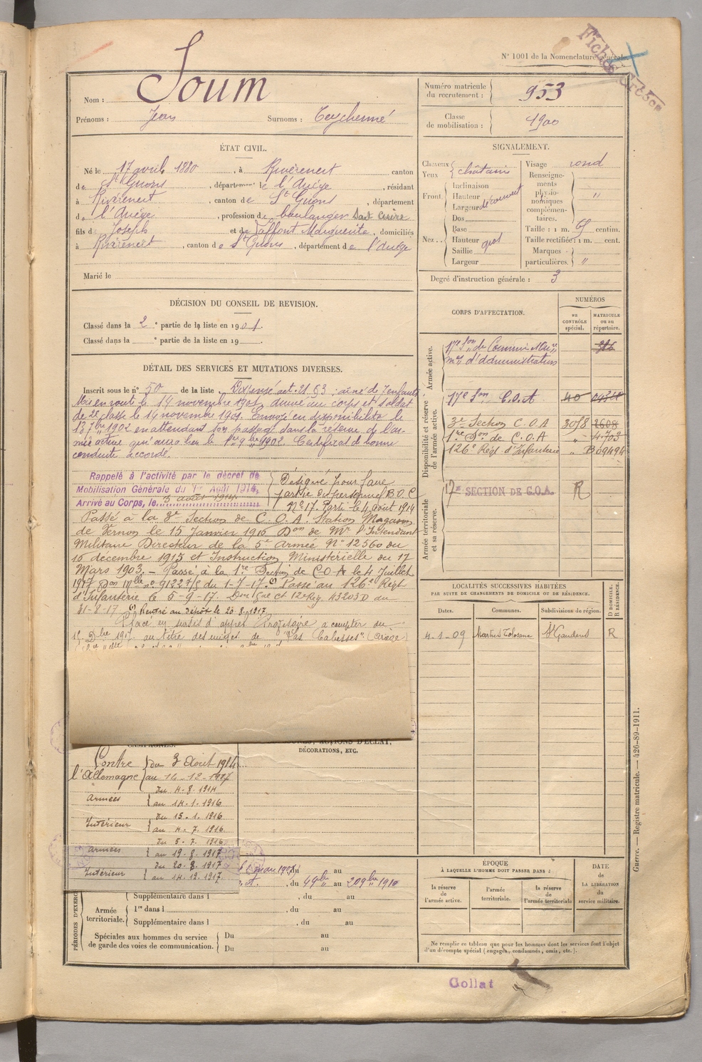 | Soum | Jean dit Teychenné | FOIX | 129 W 5 | 1900 | Rivèrenert | Rivèrenert | 953 |