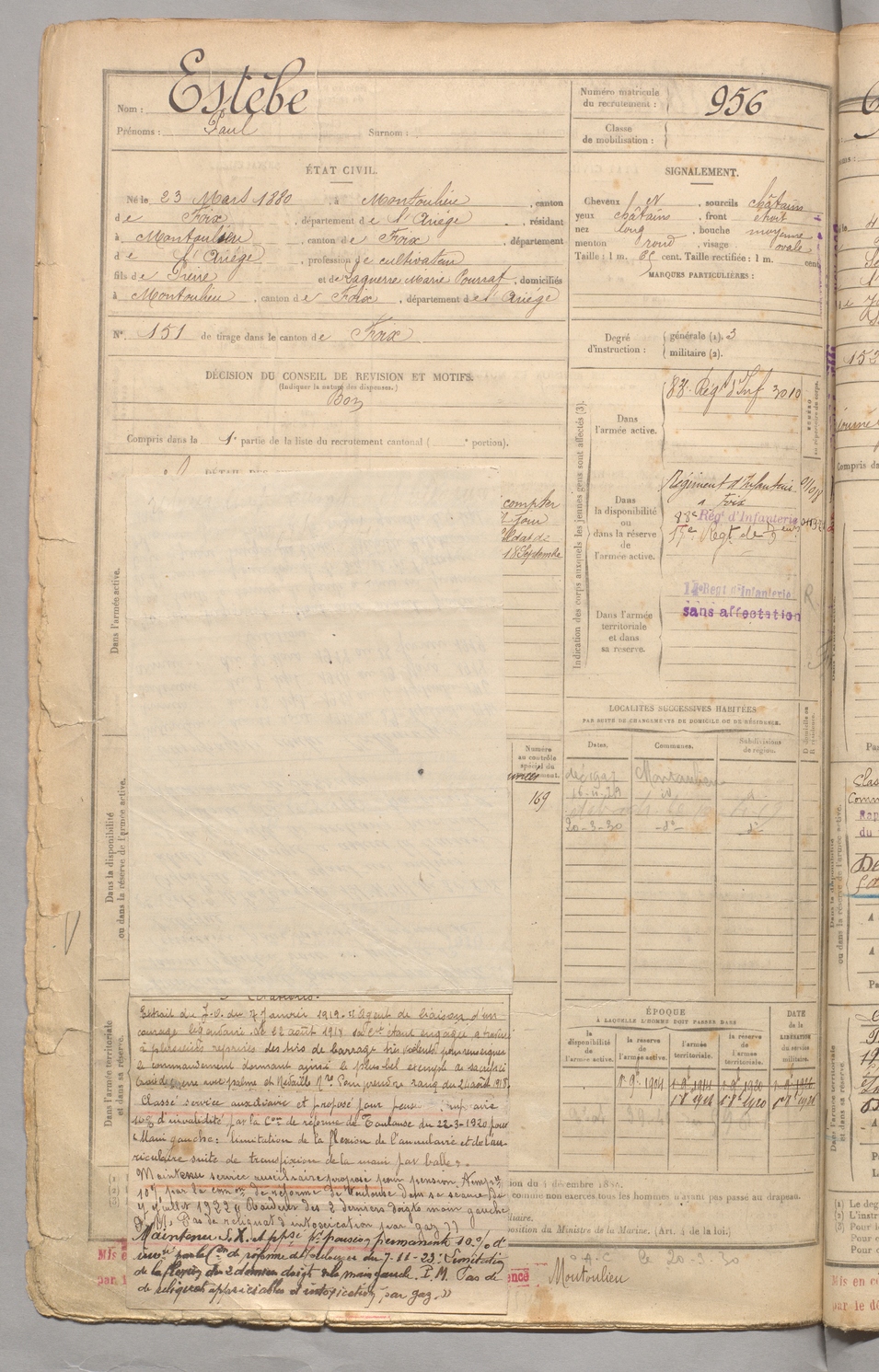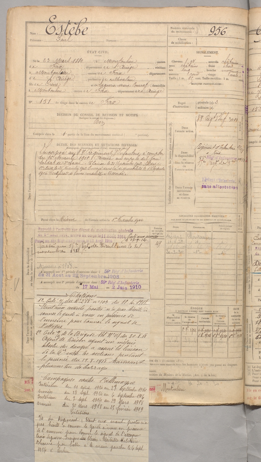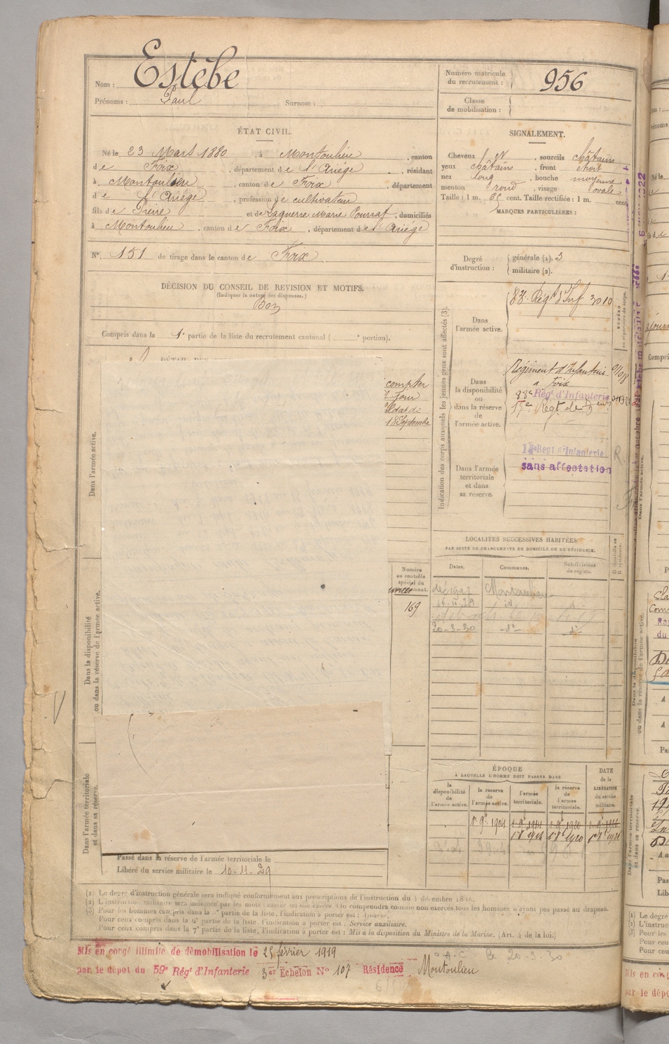 | Estèbe | Paul | FOIX | 129 W 3 | 1900 | Montoulieu | Montoulieu | 956 |