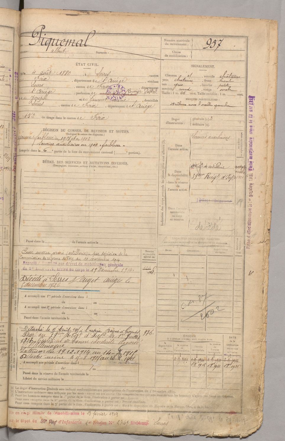 | Piquemal | Albert | FOIX | 129 W 3 | 1900 | Serres-sur-Arget | Serres-sur-Arget | 957 |
